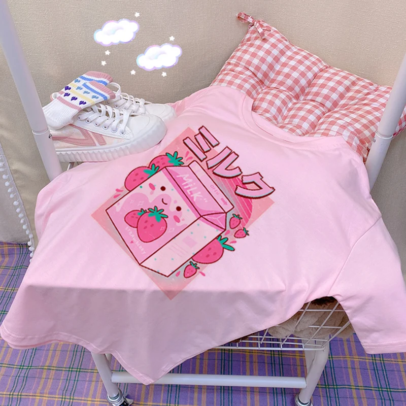 Женская Винтажная футболка в стиле 90-х с принтом клубники и молочных коктейлей, розовая футболка с коротким рукавом Ulzzang Harajuku Y2K