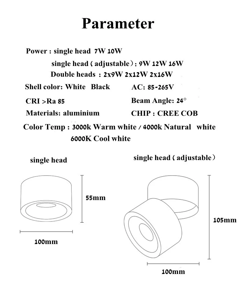 Параметры продукта Светодиодный светильник Вход Напряжение: AC85-265V/110V/220V 50/60Hz Мощность: 7 Вт/9 Вт/10 Вт/12 Вт/16 Вт/2x 9 Вт/2x1 2 Вт/2x16вт Регулировка яркости: Да Индекс цветопередачи (CRI):>Ra85 Угол луча: 60 ° Светодиодный чип: C0B чип (Epistar) Световой поток: 95 ~ 110 лм/Вт Температура: от-25 до 45 ° Уровень защиты: IP52 Цветовая температура: теплый белый:(2700K-3000K); Натуральный белый:(4000K-4200K); Холодный белый:(6000K-6500K) Срок службы: 50000 ~ 80000 часов Одобрено: CE/RoHS/FCC/3C Гарантия: 3 года Материал: литье под давлением алюминий + линзы Происхождение: Гуандун (Китай)