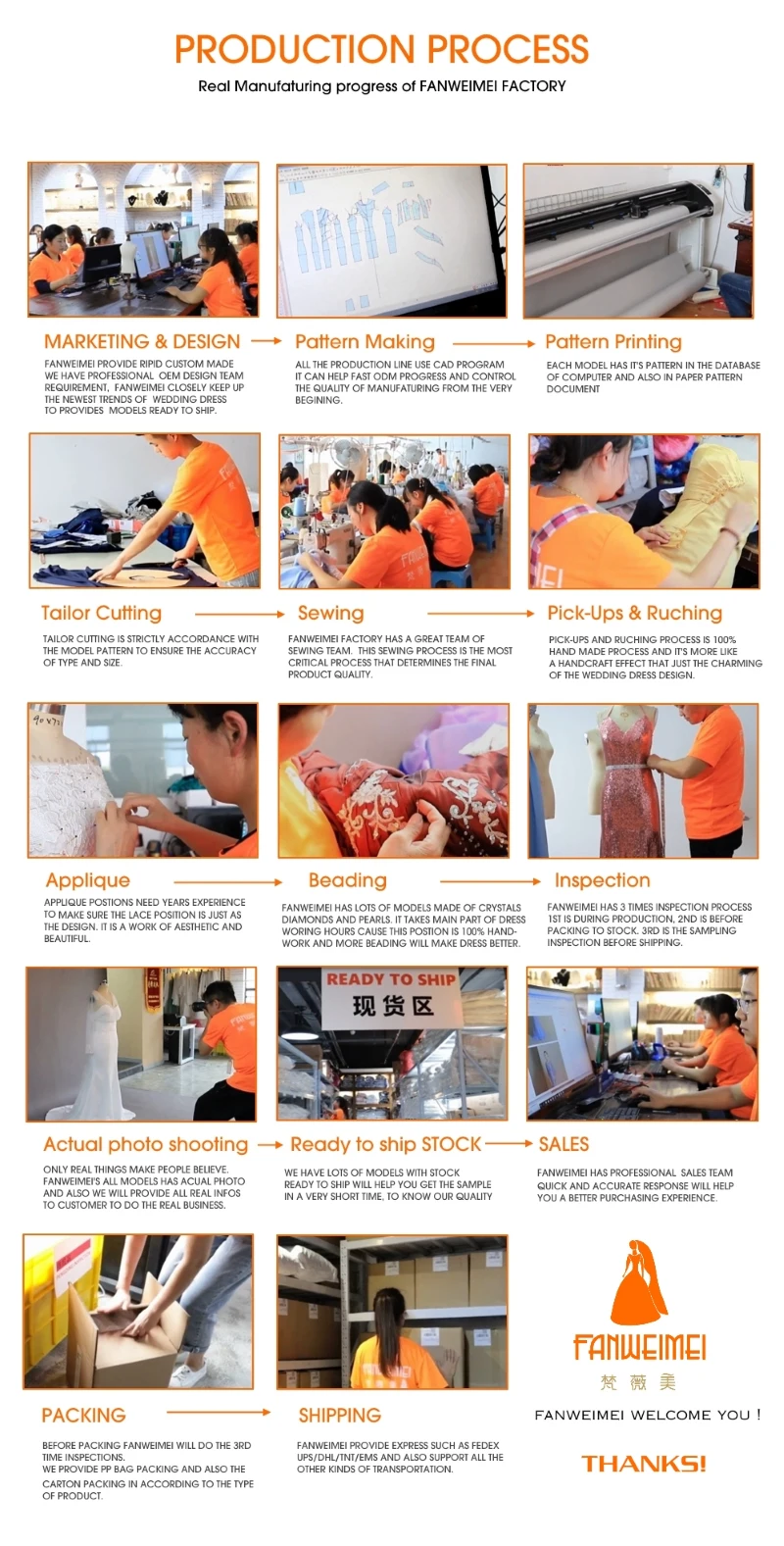 1. Мы (FANWEIMEI) фабрика в городе Сучжоу Китая, мы можем обрабатывать изготовление и доставку очень быстро. Для стандартного размера обычно требуется 3-10 дней. Для изготовления на заказ требуется 10-15 дней.2. Мы делаем много реальных фотографий для большинства наших моделей и будем продолжать обновлять реальные фотографии на страницах, что заставит вас поверить, что вы видите то, что вы получаете.3. Выбор размера-это самая важная вещь. Пожалуйста, убедитесь в строгом соответствии с нашей таблицей размеров, особенно с моделями с молнией на спине платья.Если вам нужно платье на заказ, пожалуйста, свяжитесь с нами, мы предоставим вам данные, которые вам нужно измерить, а также инструкцию по измерению.4. Если вам нужно это платье очень срочно, пожалуйста, не выбирайте Aliexpress стандартную доставку или любой другой способ бесплатной доставки, который медленная скорость доставки, мы предлагаем вам связаться с нами о дате использования платья, мы расскажем Йо, можно ли выбрать другие методы быстрой доставки.Хорошего дня!О нас