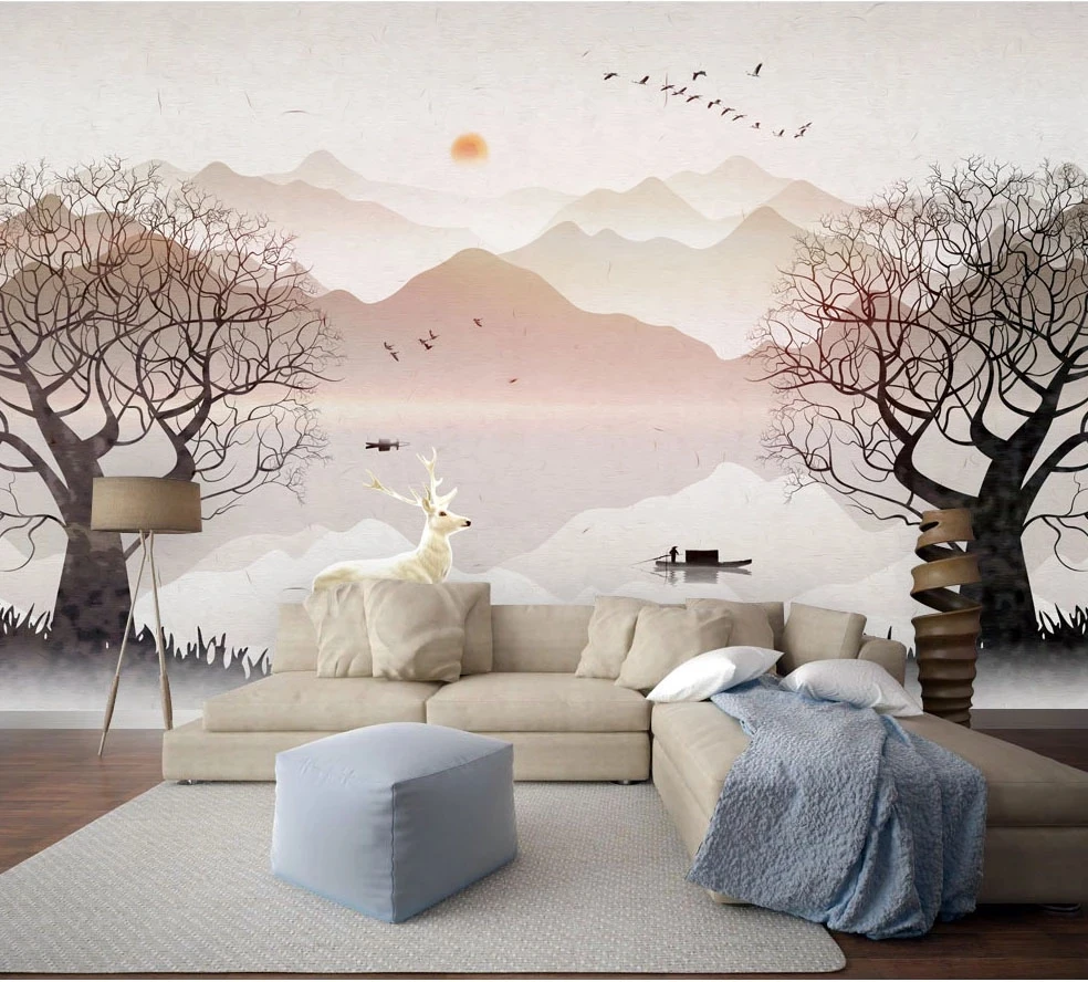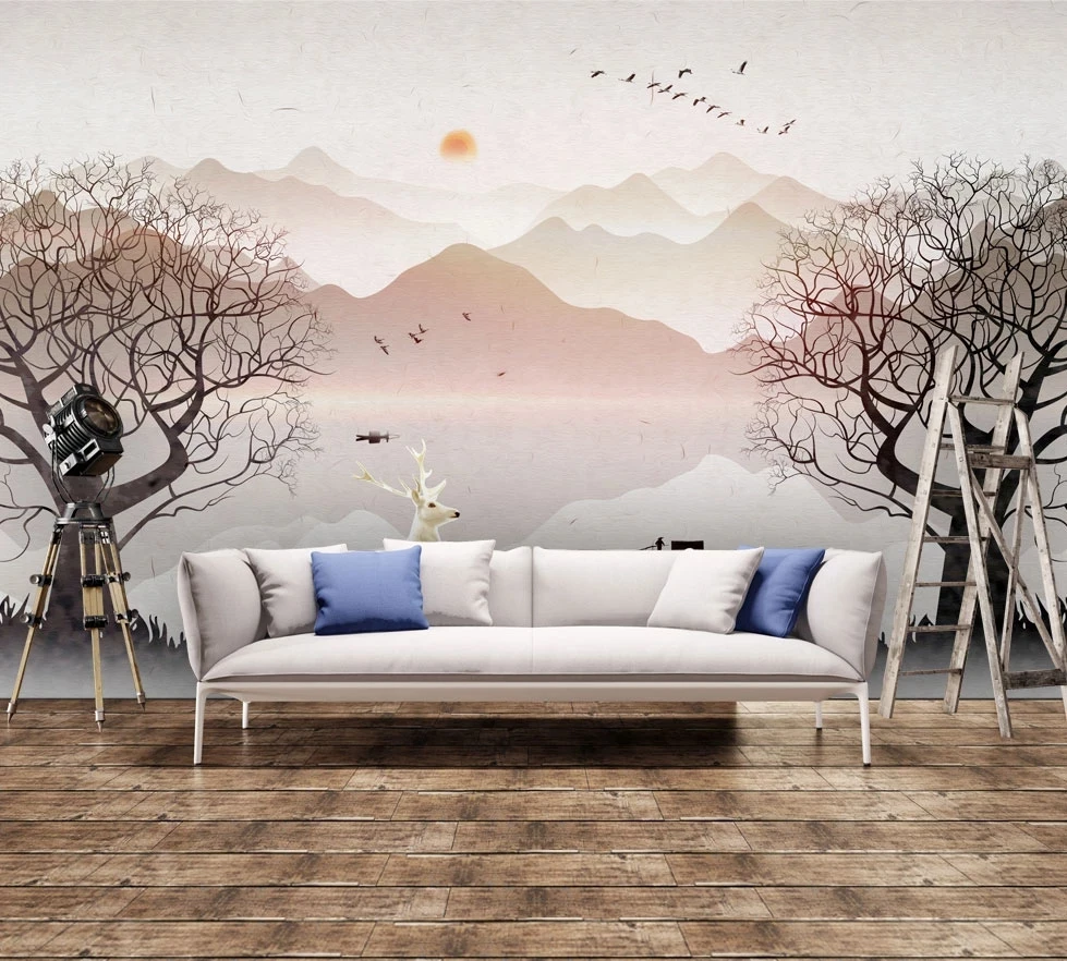 Большие самоклеящиеся обои на заказ, деревья, олень, 3D фотообои для гостиной, дивана, фоновая живопись, водонепроницаемая