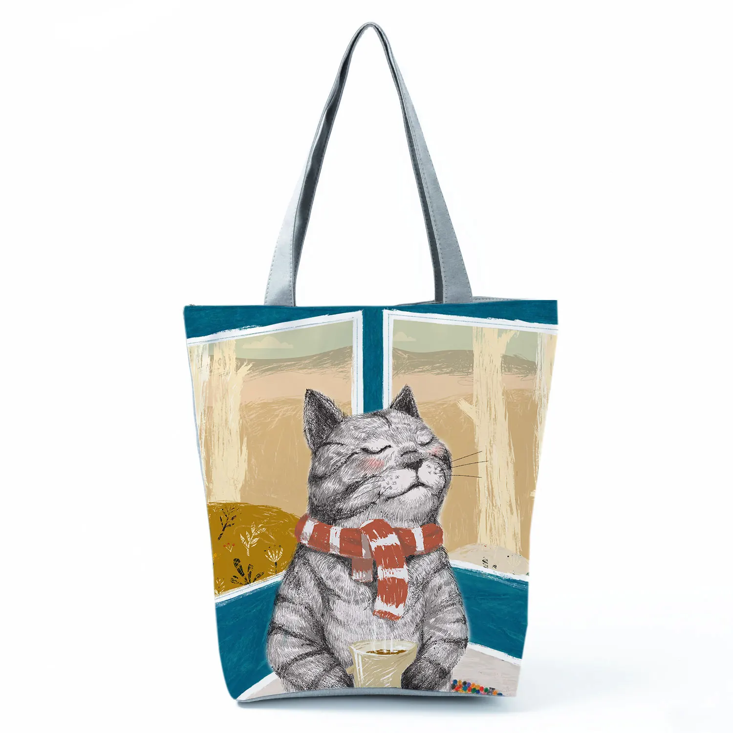 Лидер продаж, женская сумка с принтом кошки, вместительная сумка на плечо, Экологически чистая многоразовая складная сумка для покупок с мультяшным животным, индивидуальный узор