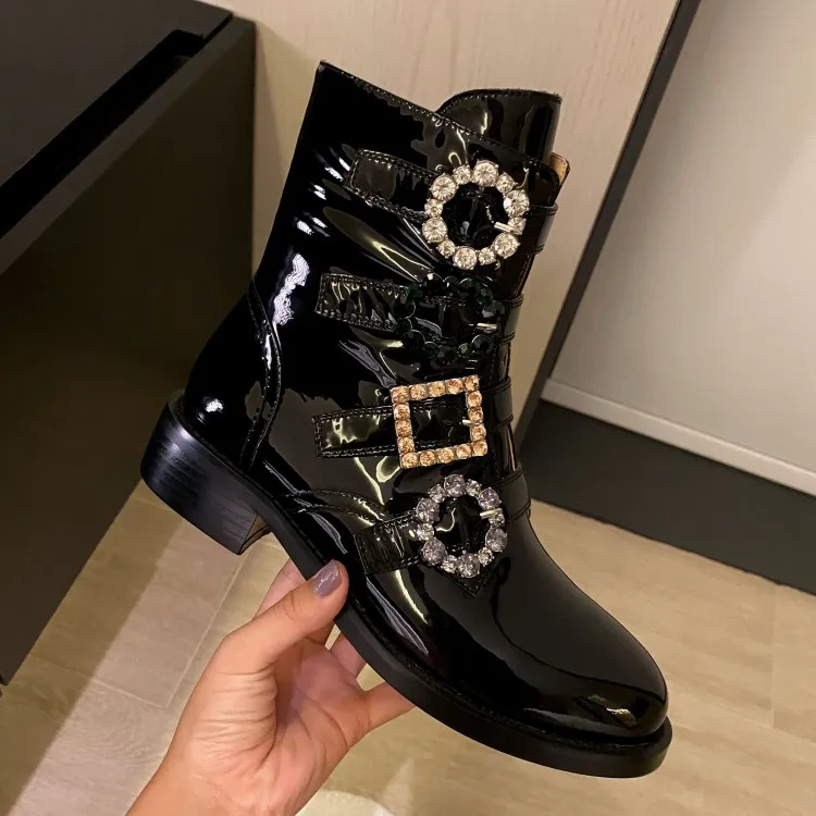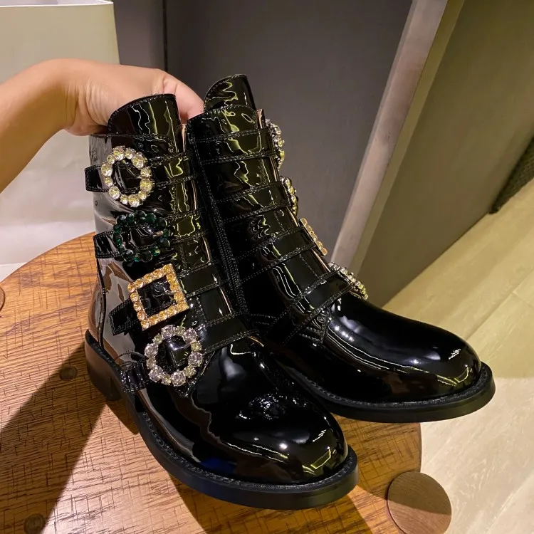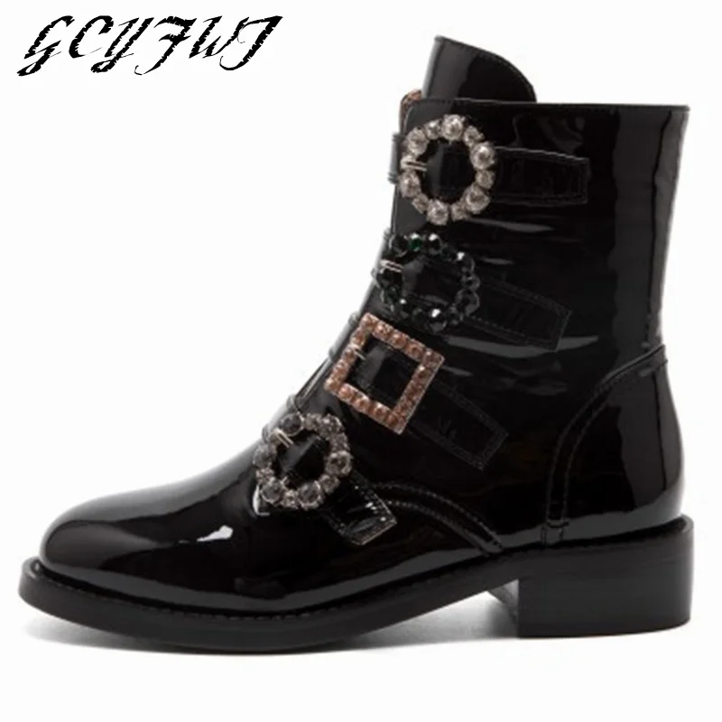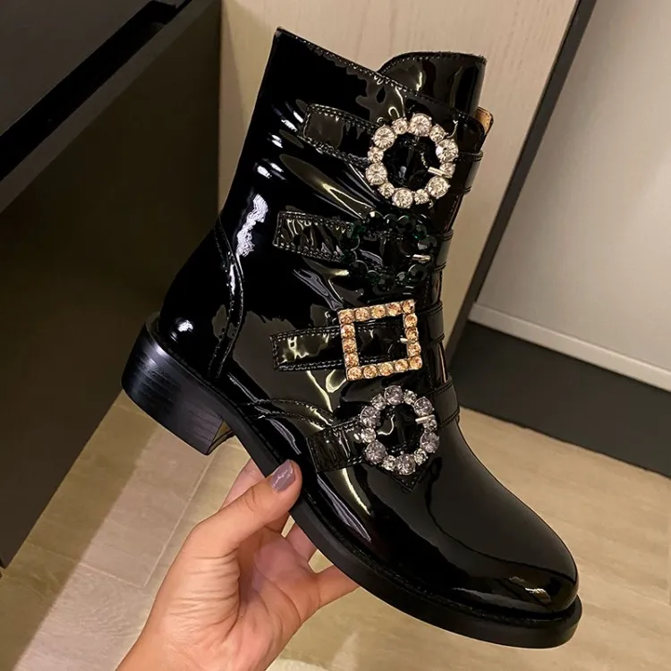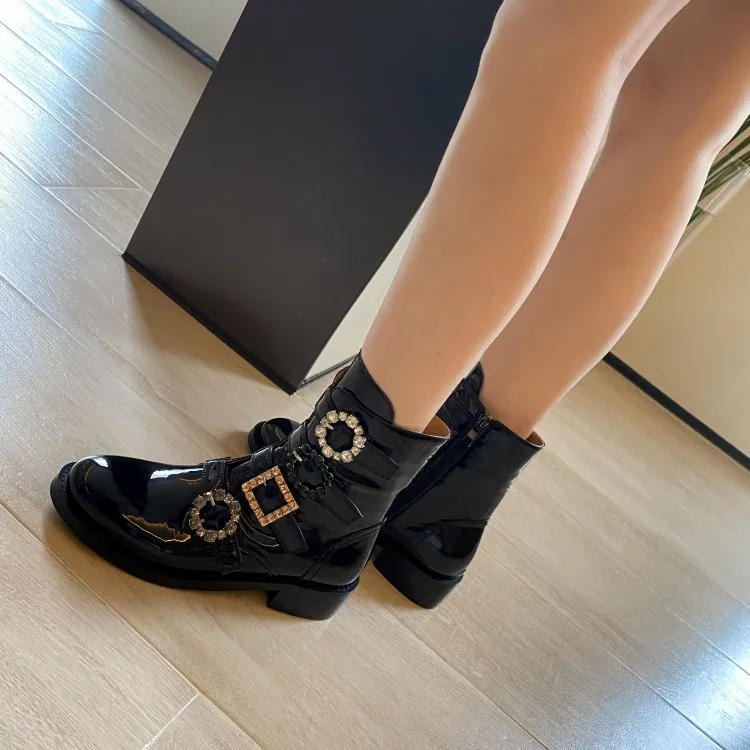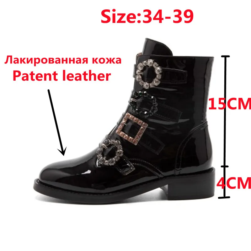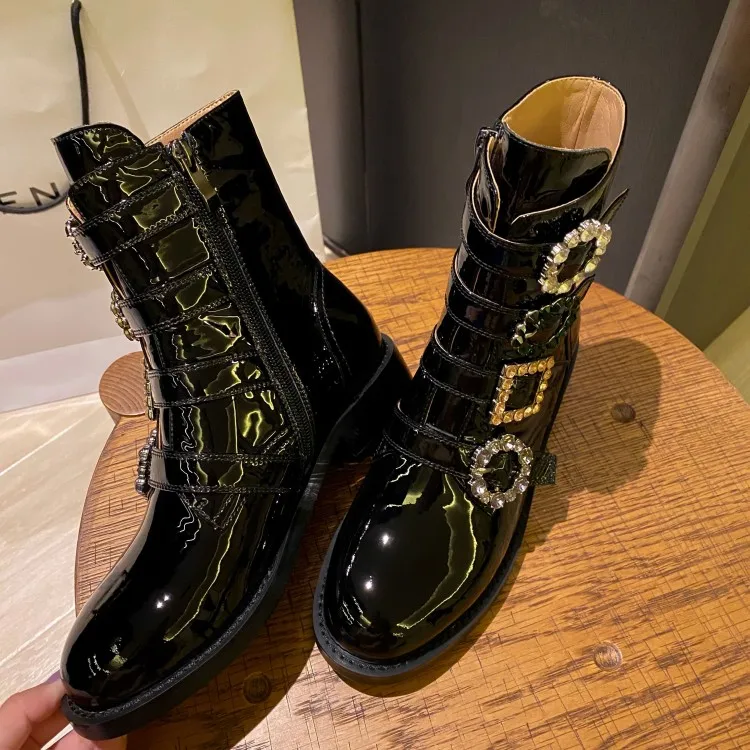Сапоги женские из лакированной кожи, на платформе, с квадратным носком и пряжкой