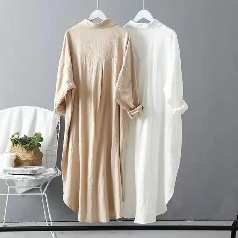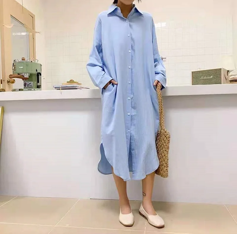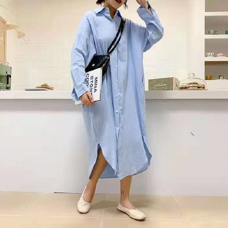 Платье-рубашка женское свободного покроя, из 2021 хлопка, с длинным рукавом
