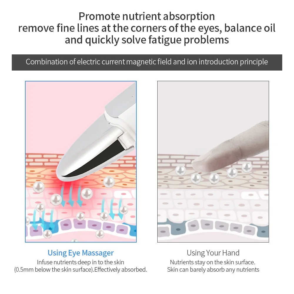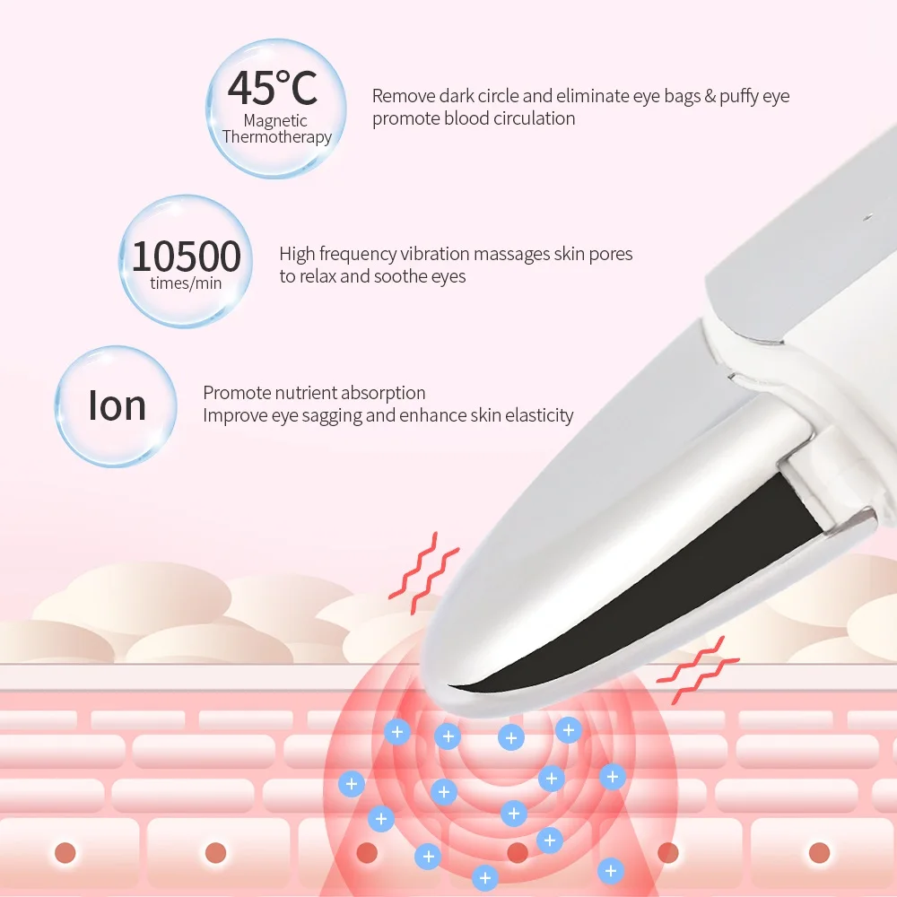 1. Эргономичная обтекаемая ручка обеспечивает удобные и безопасные ручки. 2,45 ℃ горячий компресс, быстрое введение, улучшает способность поглощения кожи. 3. Высокочастотный Вибрационный массаж может эффективно активировать метаболизм клеток кожи для ускорения восстановления кожи, затягивания кожи и укрепления упругости кожи. 4. Ионитофорез, способствует поглощению питательных веществ 5. Встроенный аккумулятор емкостью 600 мА · ч может питаться напрямую через usb-зарядку для непрерывного ухода за глазами 6. Способствует регенерации коллагена и кровообращению, чтобы снять усталость глаз и расслабить мышечное напряжение, также может эффективно уменьшить меланин, затянуть кожу и устранить морщины, мешки для глаз, темные круги и т. д. 7. Легкий и портативный дизайн, вы можете положить его в сумку для легкого доступа в любое время и в любом месте, подходит как для дома, так и для путешествий.Продукт включает: