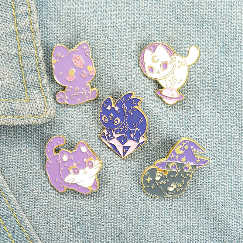Эмалированные значки в виде фиолетового кота, шляпы ведьмы и хруста...