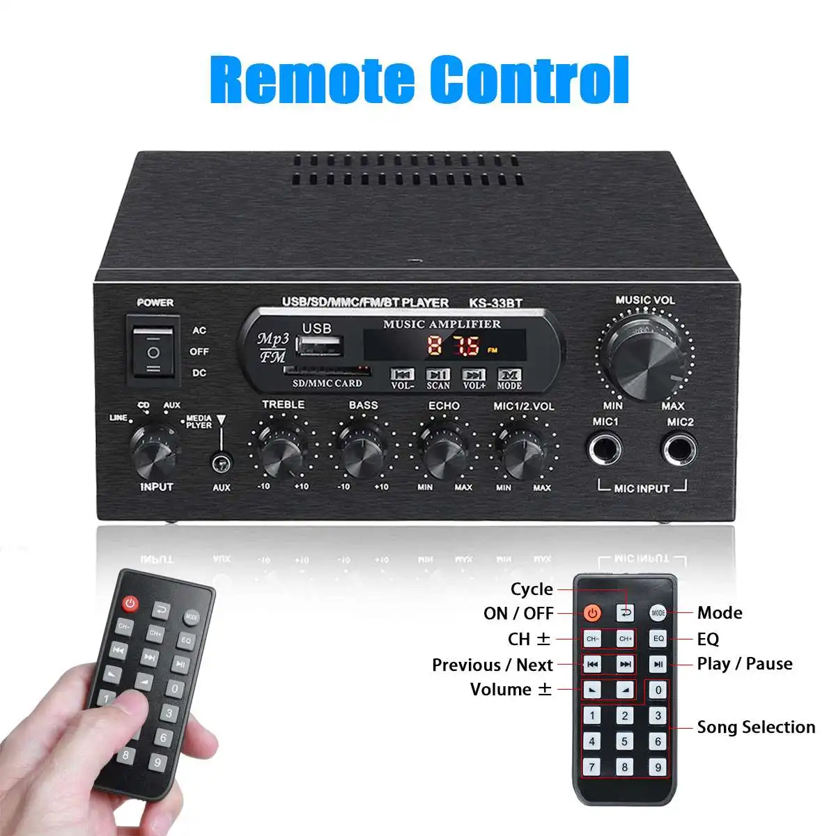 Особенности:-Цифровой mp3-плеер.-Интерфейс bluetooth для потоковой передачи музыки с мобильный телефон-Слот USB / SD для воспроизведения MP3 с карты памяти или карты-Поддерживает fm-стерео радио.-Поддержка 2 way вход для микрофона.-С высокими частотами, басами и регулятором громкости, очень прост в использовании.-Низкое Искажение обеспечивает более четкий, сильный и мощный звук.-2 канальный выход.-С функцией дистанционного управления.-Питание постоянного/переменного тока, подходит для домашнего использования.-Подходит для HiFi, систем домашнего кинотеатра и караоке