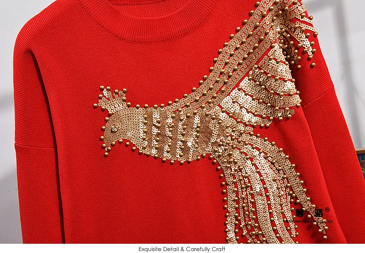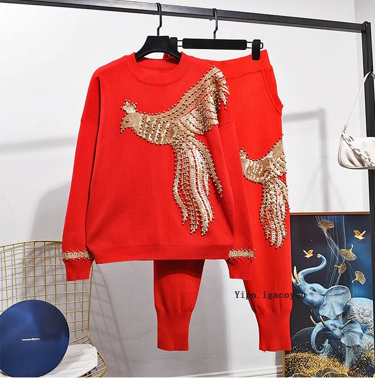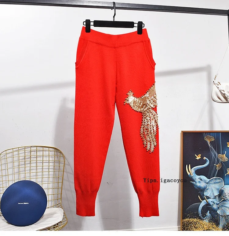 Красный, черный, белый, серый вязаный спортивный костюм с бисером и блестками Феникс, Женский Свободный Повседневный свитер, брюки-карандаш, вязаный наряд для женщин