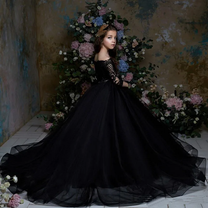 Черные платья с длинным рукавом и цветочным принтом для девочек, свадебные платья с кристаллами и бусинами, кружевные аппликации, пышные платья для девочек, детская официальная одежда