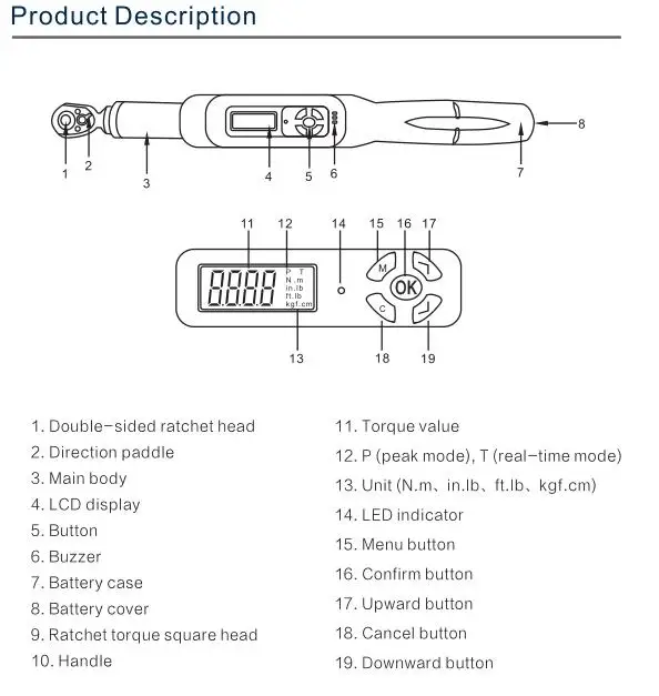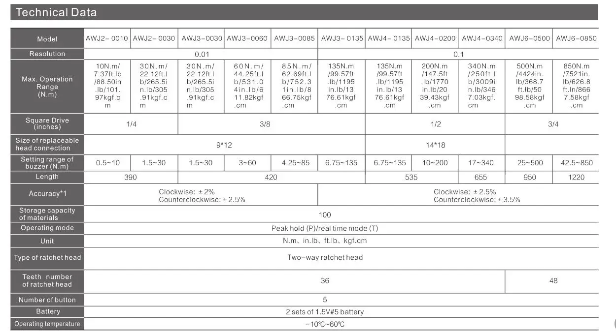 Основная цель и применимый диапазонТрещоточный ключ с цифровым дисплеем и Сменная головка с цифровым дисплеем отличаются от стандартного динамометрического ключа, в котором сменный головной ключ AWJC с прикрепленной трещоточной головкой может быть заменен на открытую головку, сливовый цветок для украшения головы, подвижная открывающаяся головка и т. Д. В любое время. Оба имеют Мощные рабочие функции, включая настройку крутящего момента; Настройку блока; Настройку режима; Хранение значений; Очистку стоимости; Вывод значения и функцию коррекции пользователя.