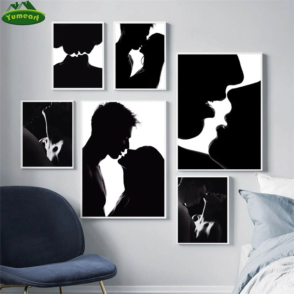 Черно-белая женщина мужчина целующийся любовник силуэт искусство холст живопись плакаты и принты настенные картины для гостиной домашний декор