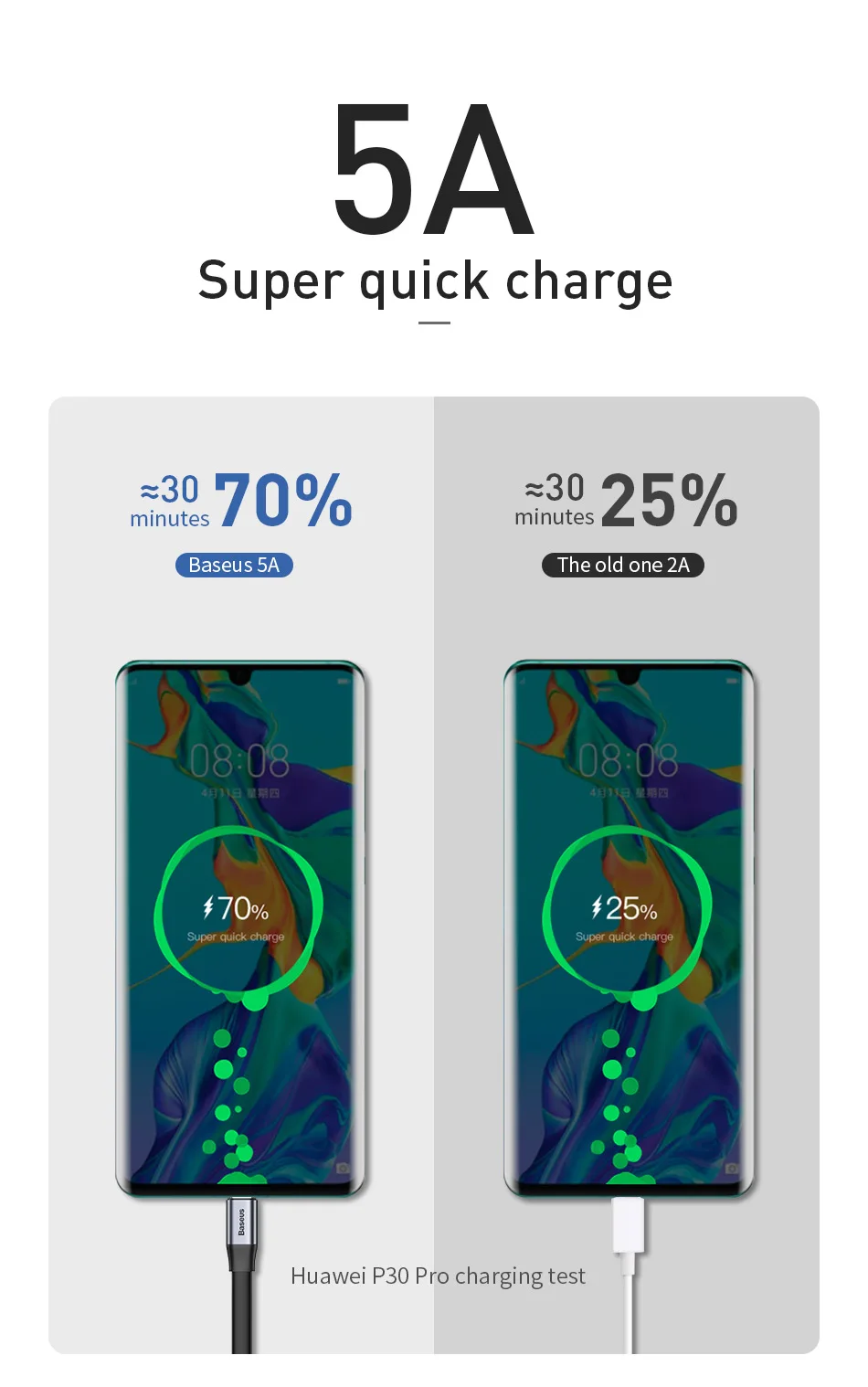 Кабель Baseus usb-c, 5 А, для Huawei P30, P20, Mate 30, 20, P10 Pro...