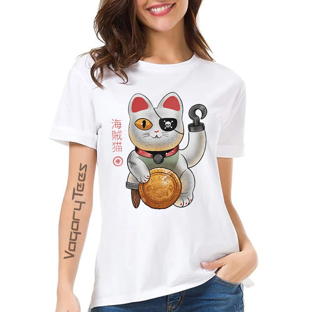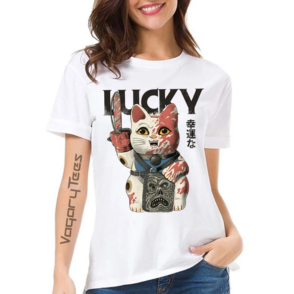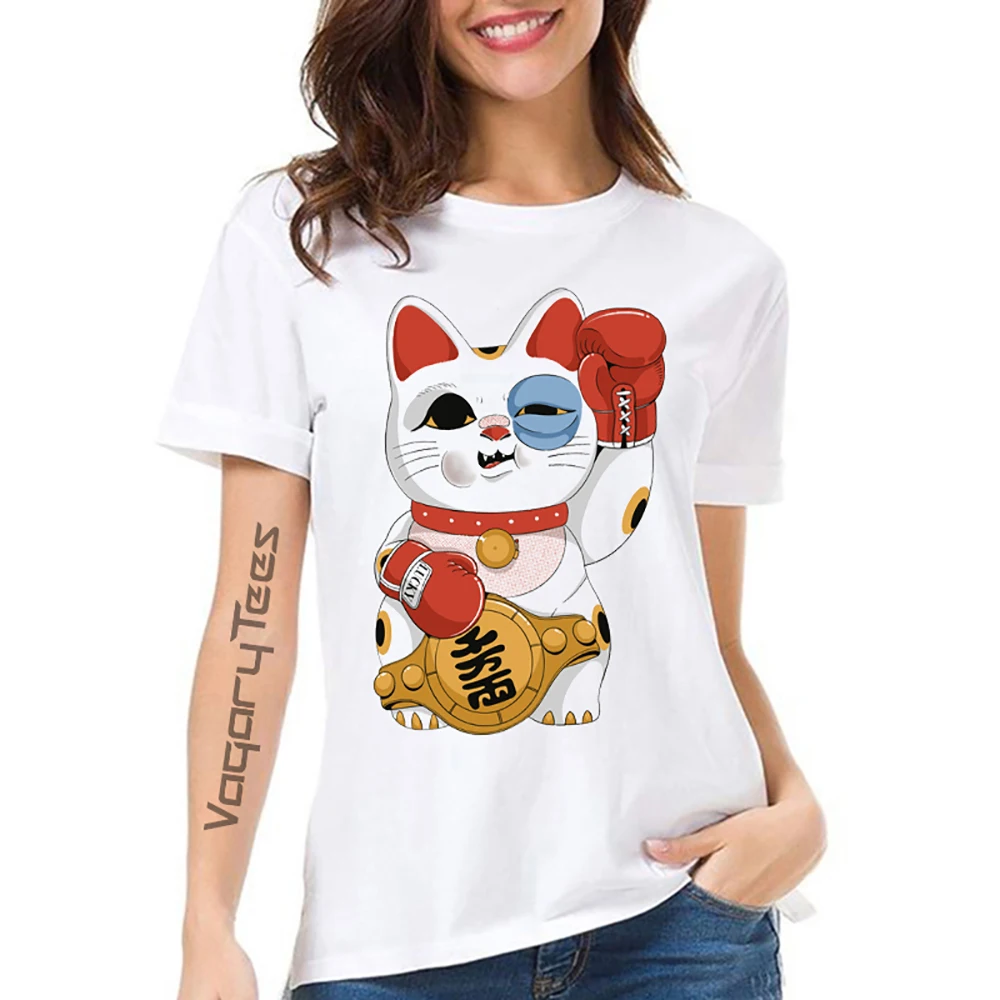 Летняя новая белая Повседневная футболка с коротким рукавом для девушек с рисунком счастливого кота