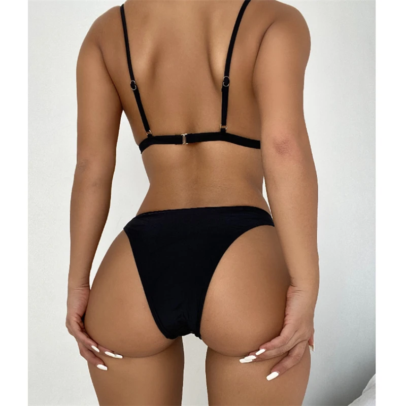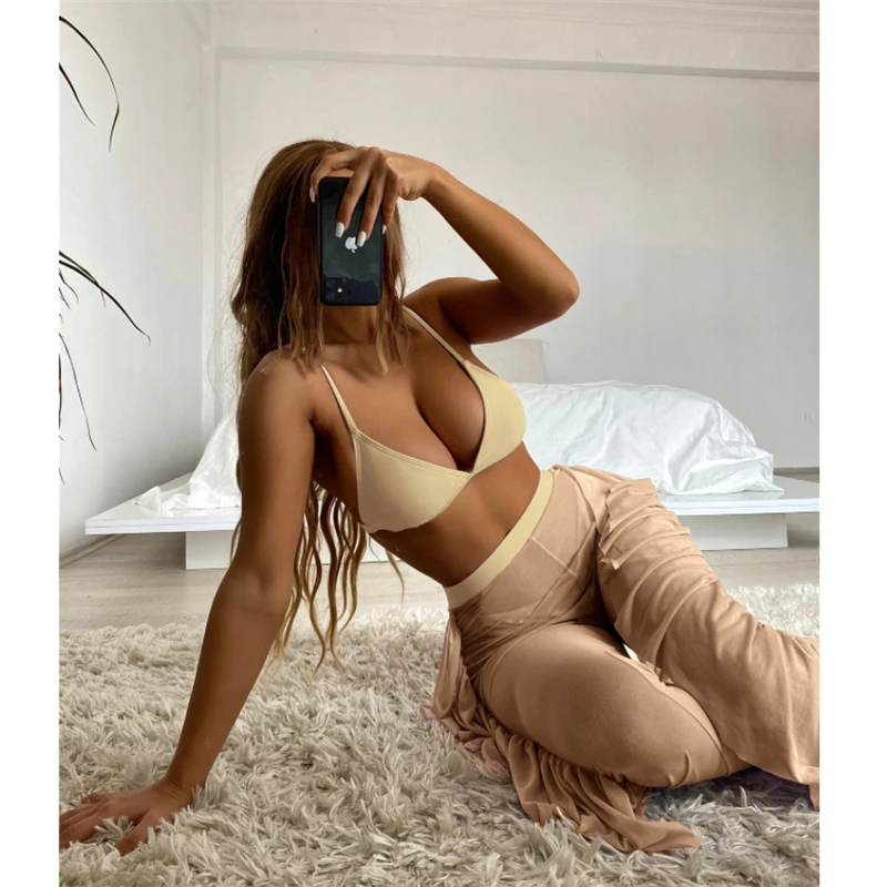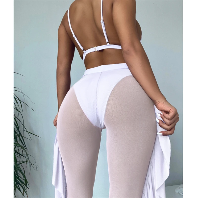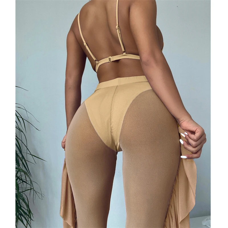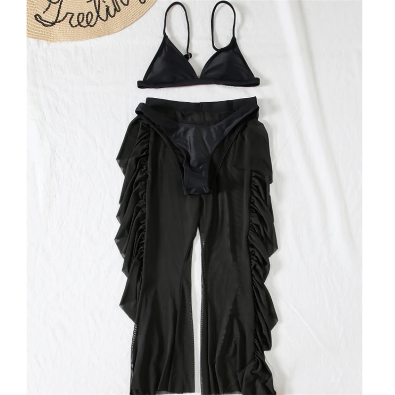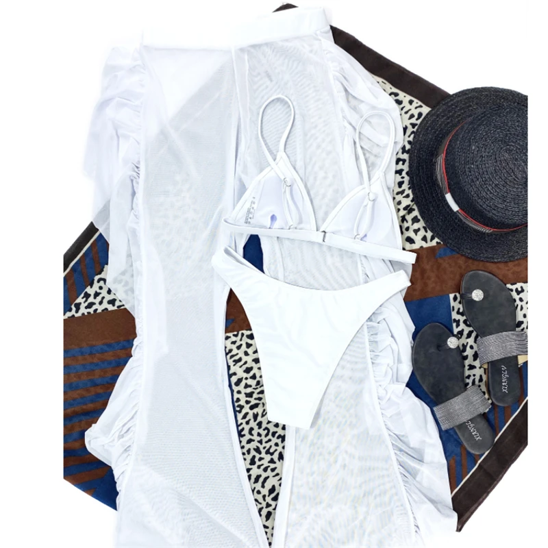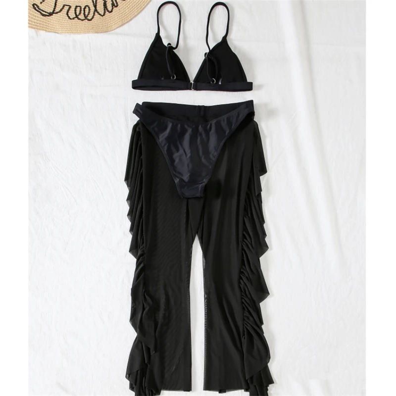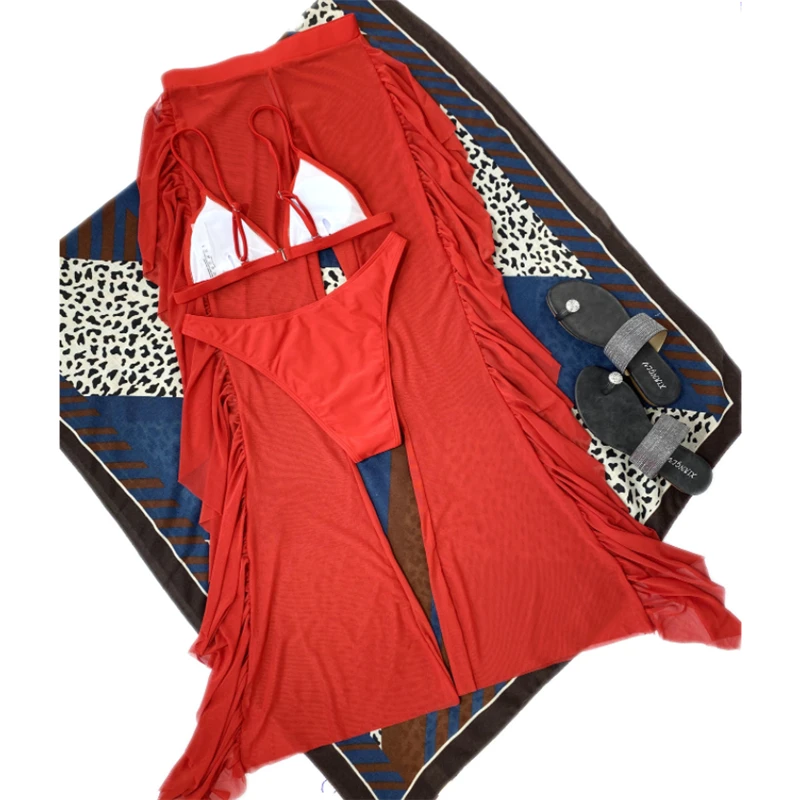 Сексуальный однотонный комплект бикини GNIM 2021, летняя одежда для плавания с оборками, женская пляжная одежда из трех предметов, накидка, купальный костюм с высокой талией, бикини