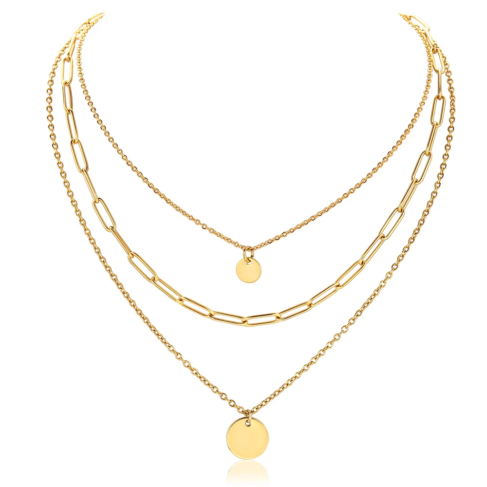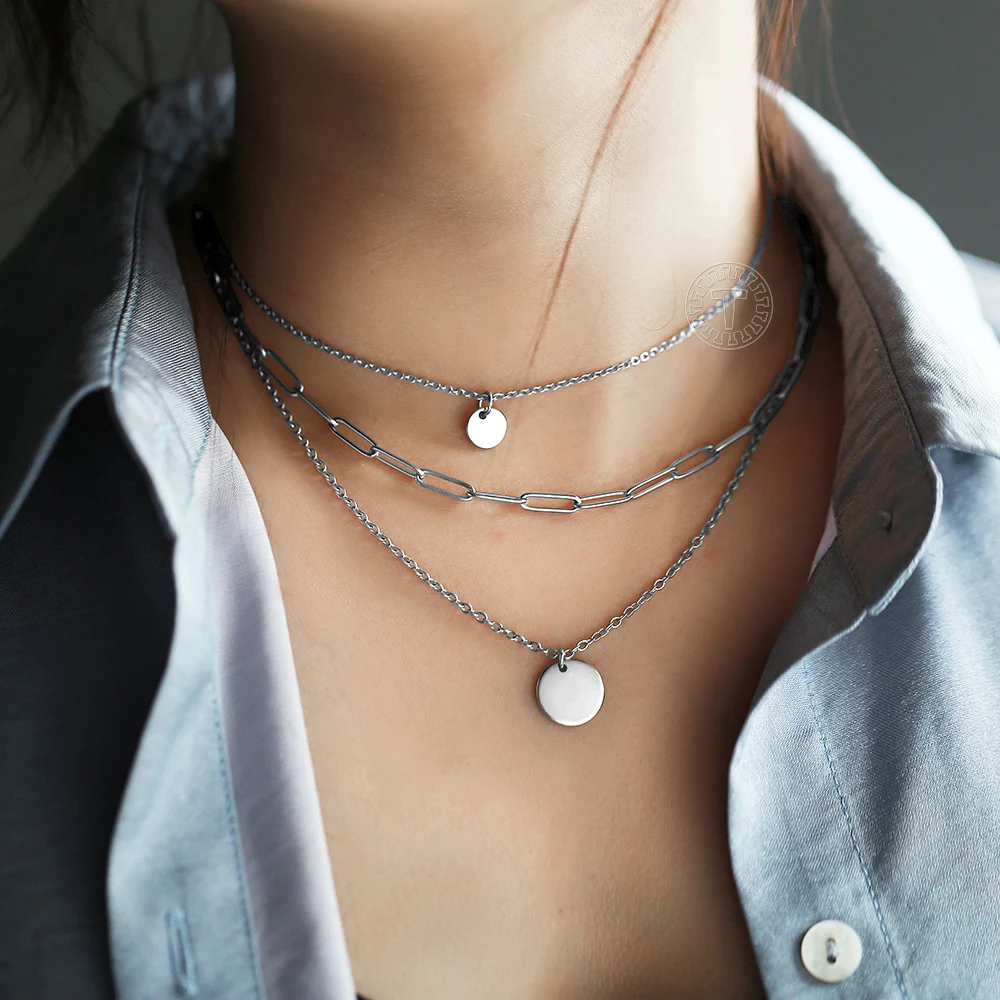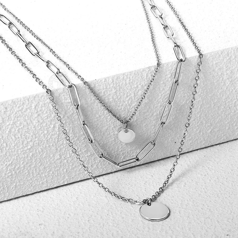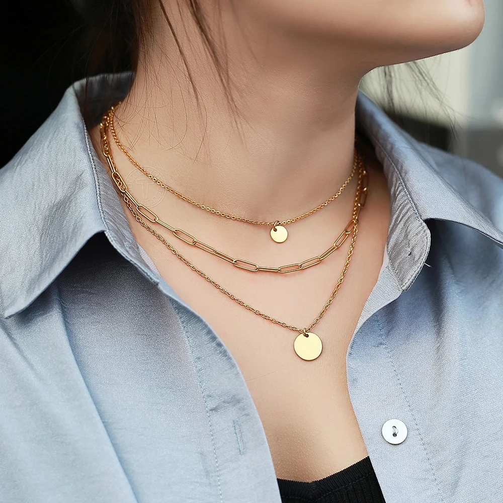 Имя гравировка медальон в форме монеты Шарм ожерелье Серебряный цвет нержавеющая сталь многослойный чокер для женщин Rolo коробка цепь DN268