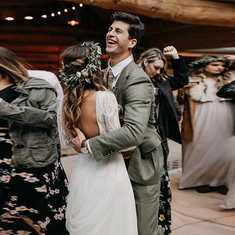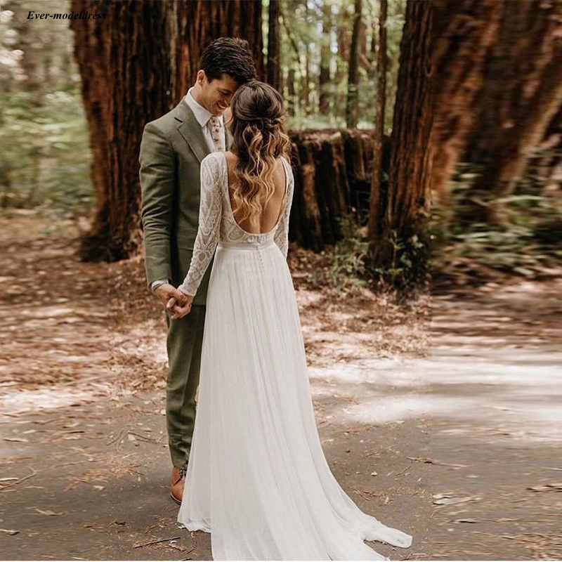 Кружевные свадебные платья в богемном стиле 2021, шифоновые юбки с глубоким круглым вырезом, длинными рукавами и открытой спиной, шикарные свадебные платья в сельском стиле, платье