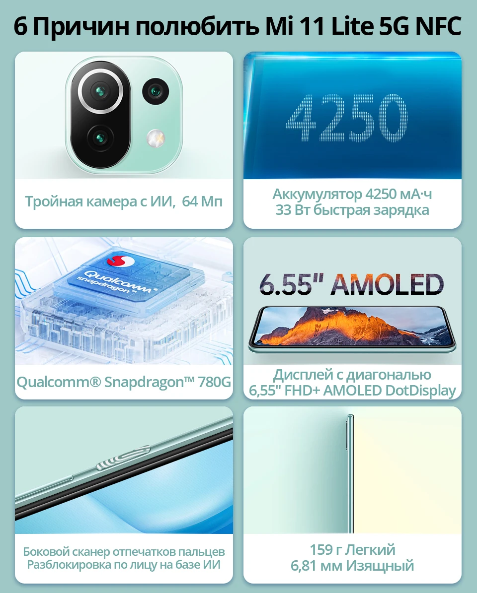 Смартфон Xiaomi Mi 11 Lite, 6 ГБ + 128 Гб, Snapdragon 780G восемь я...