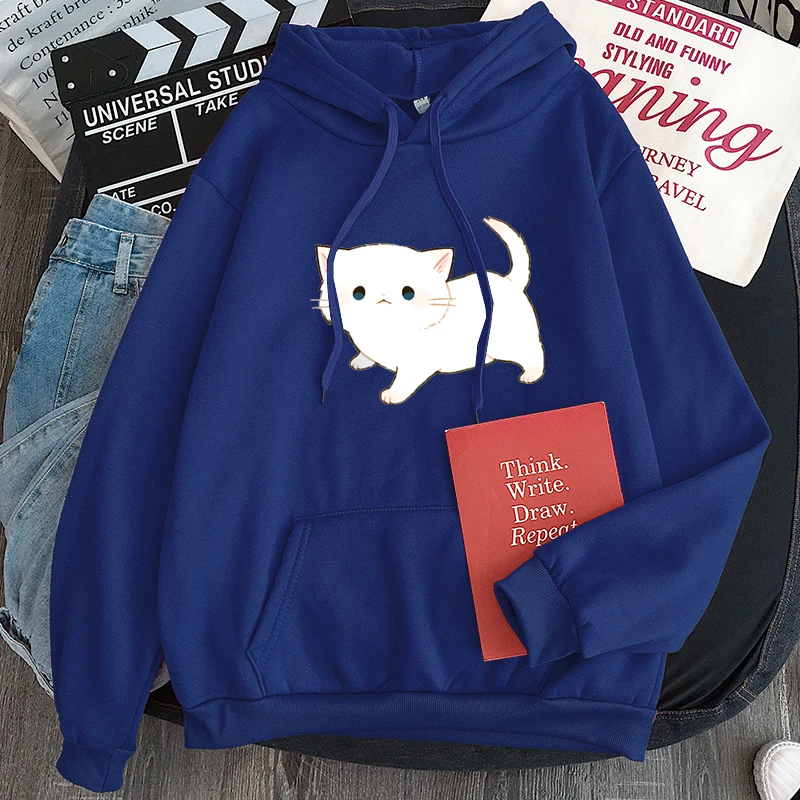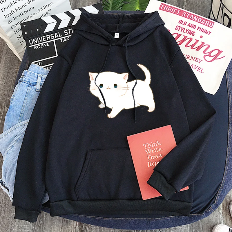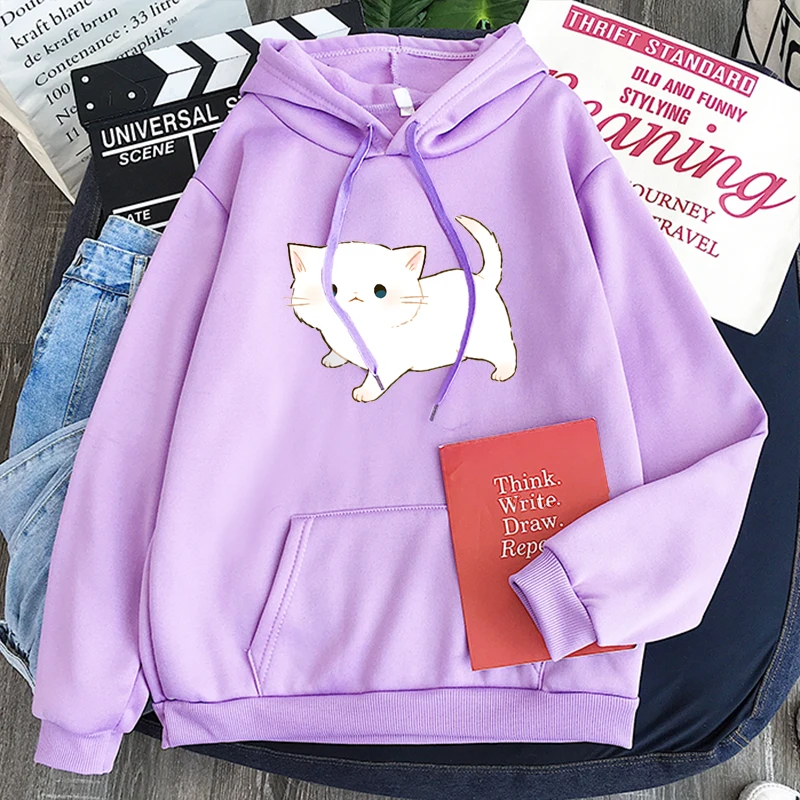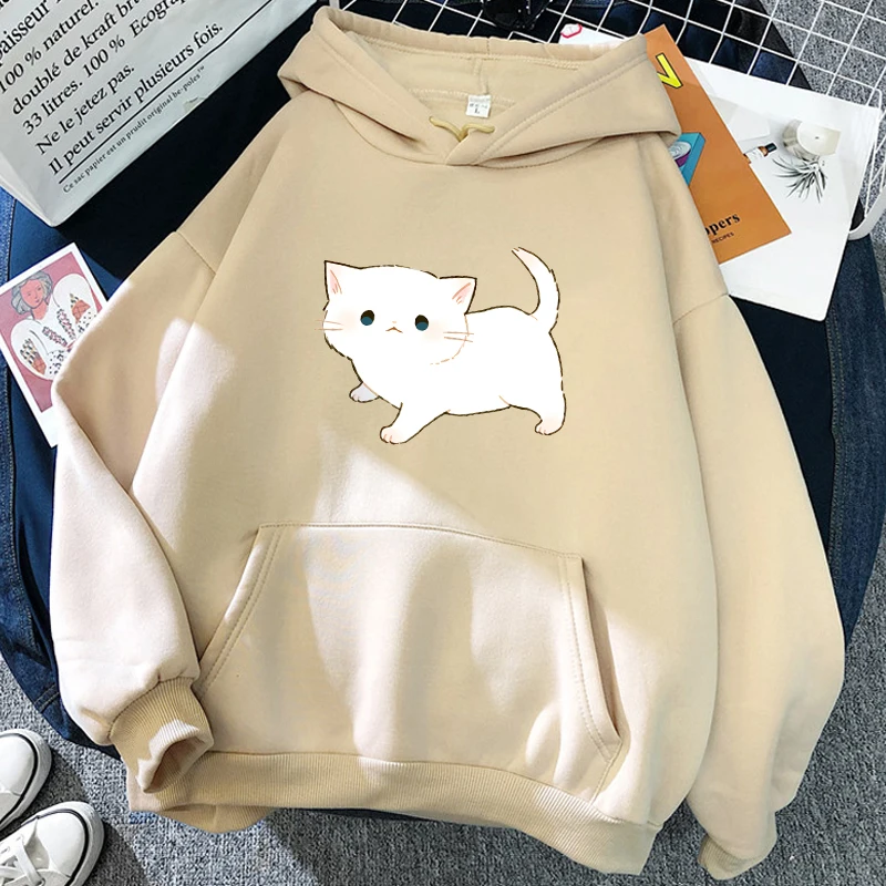 Женские толстовки в стиле Харадзюку, розовые зимние толстовки с капюшоном и длинным рукавом, с мультяшным рисунком кота, одежда