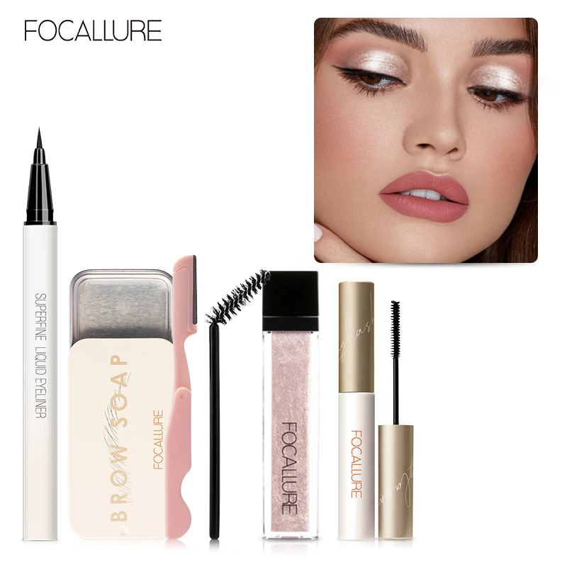 FOCALLURE 4 шт. наборы для макияжа Гель Для Бровей Жидкие тени для век Черная Подводка для глаз Тушь для ресниц водоСТОЙКАЯ Профессиональная Косметика для женщин