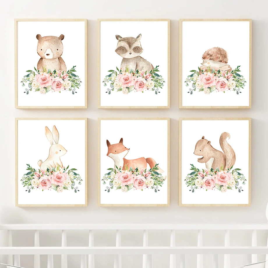 Цветы, медведь, енот, еж, скандинавские плакаты и принты, настенная Картина на холсте, настенные картины, декор для детской комнаты