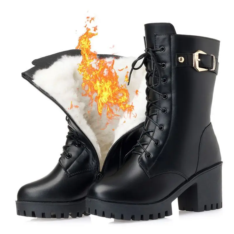 Зимние кожаные женские зимние сапоги на высоком каблуке, теплые женские военные сапоги из толстой шерсти, женские зимние сапоги высокого качества