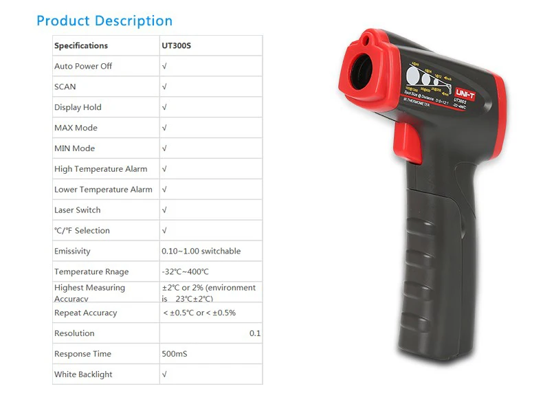 UNI-T UT300S инфракрасный термометр , диапазон цветовой температуры: -32 C 400 C, двойной дисплей, индикатор низкого заряда батареи.