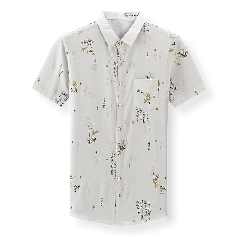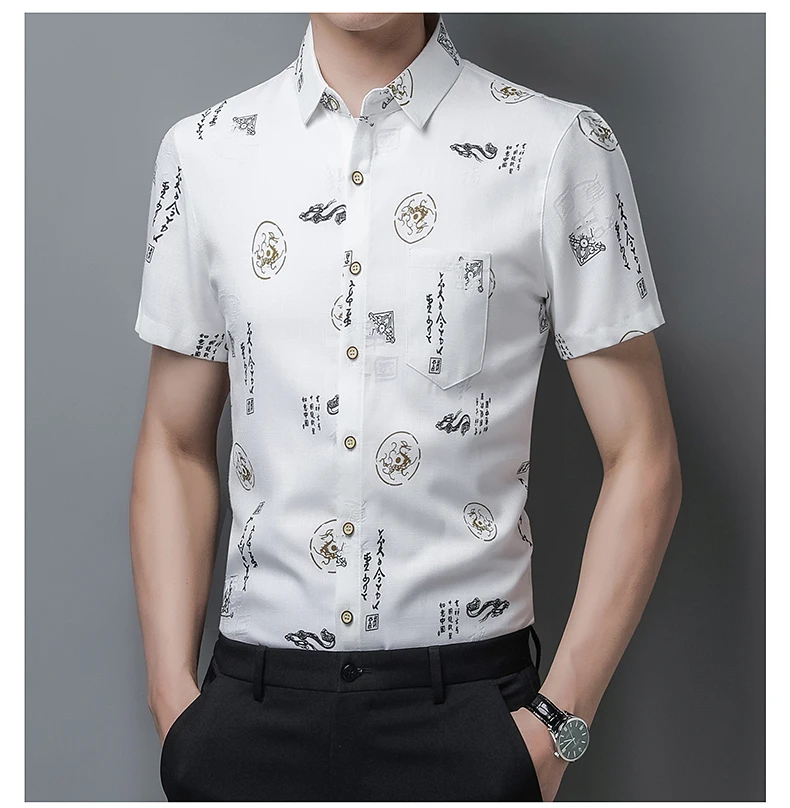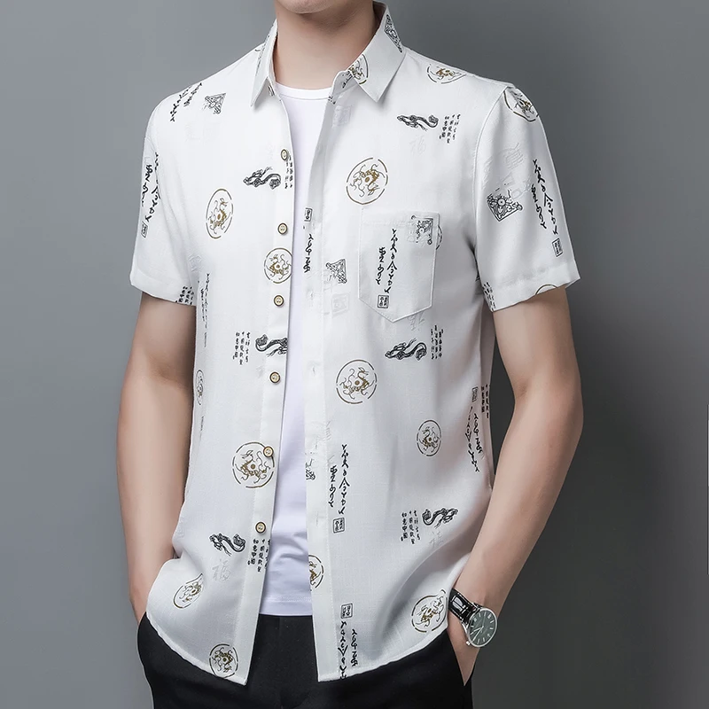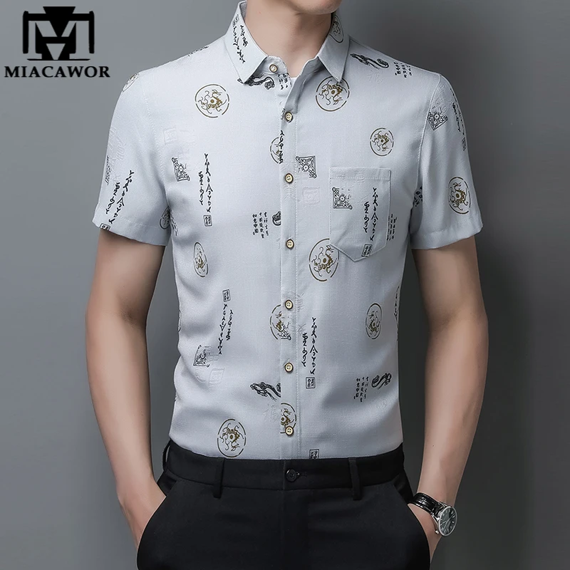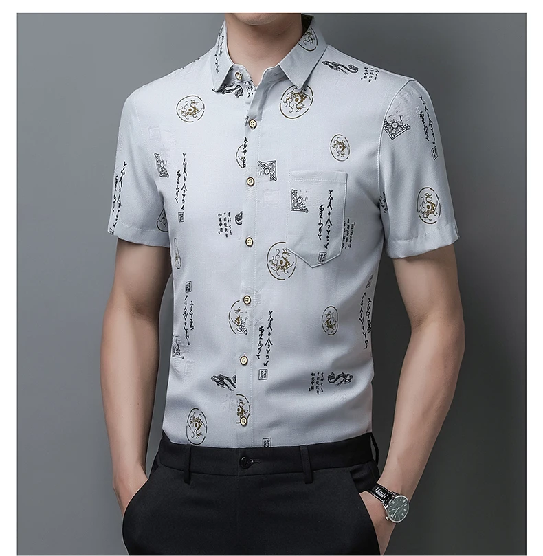 Рубашка мужская с принтом, шелковая Хлопковая сорочка с коротким ру...