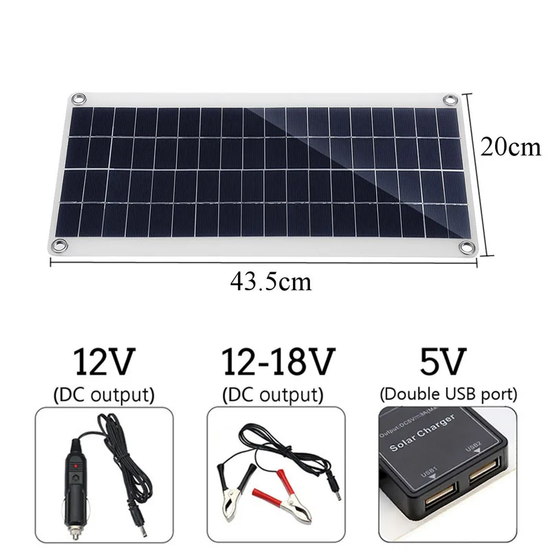 Посылка включает в себя:1X100W солнечная панель1X контроллер заряда батареи солнечных панелей (10/20/30/40A/50A)1x инвертор питания1x линия прикуривателя2 зажима● Солнечная панель мощностью 100 ВтСпецификация:Материал: поликремниевый силиконовый элементВыход USB: 5 ВКоличество порта USB: двойнойНапряжение солнечной панели: DC12-18VМощность солнечной панели: 20 ВтПодходит для: велоспорта, альпинизма, пешего туризма, кемпинга, путешествий и т. д.