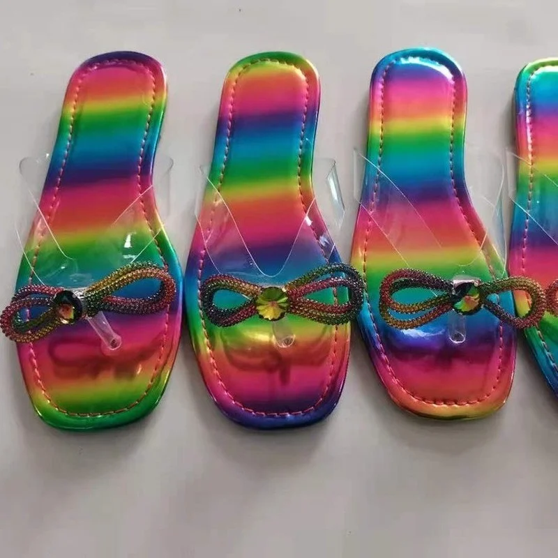 Новые Неоновые желейные кошельки и набор скользящих радужных бантиков шлепанцы и сумки Стразы плоские тапочки сумка модная обувь Chanclas Mujer