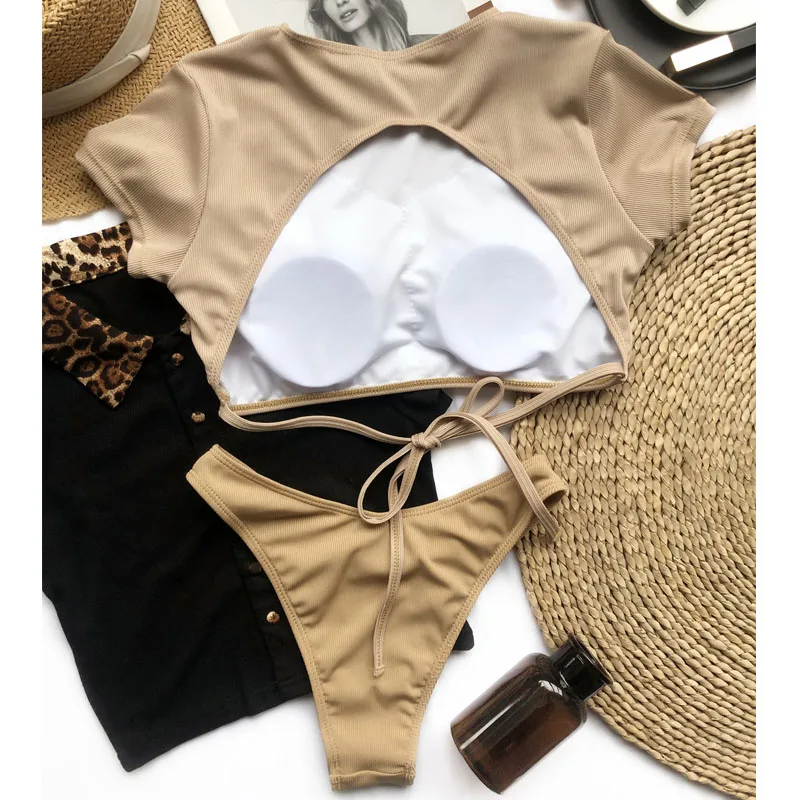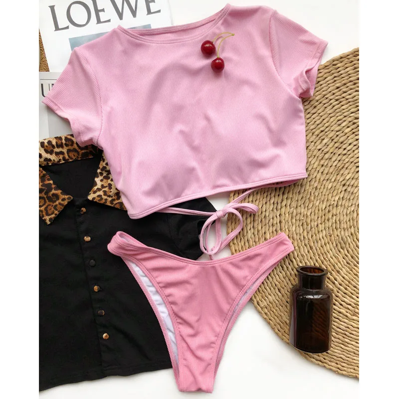 Mossha 2021 Спортивный Розовый ребристый бикини с коротким рукавом ...