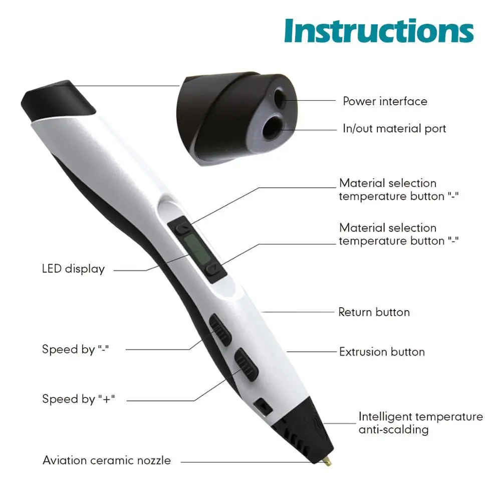 3D Printer Pen temperature useABS 180~210 Celsius Degree, PLA 160~180 Celsius Degree