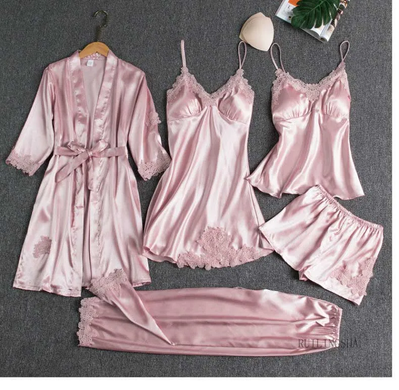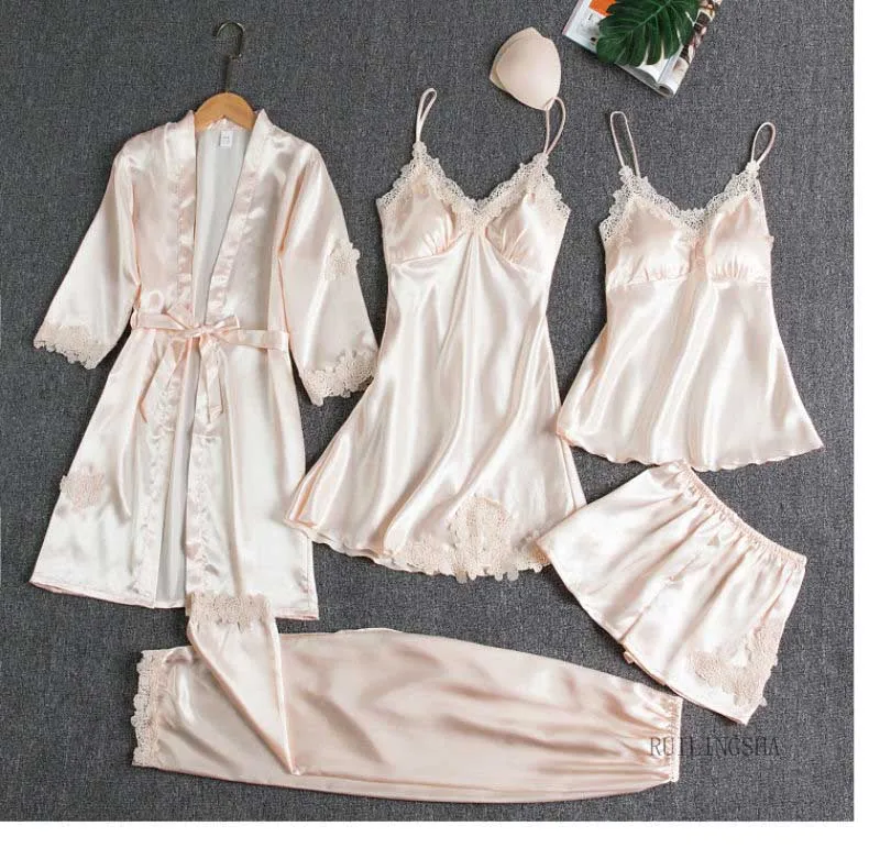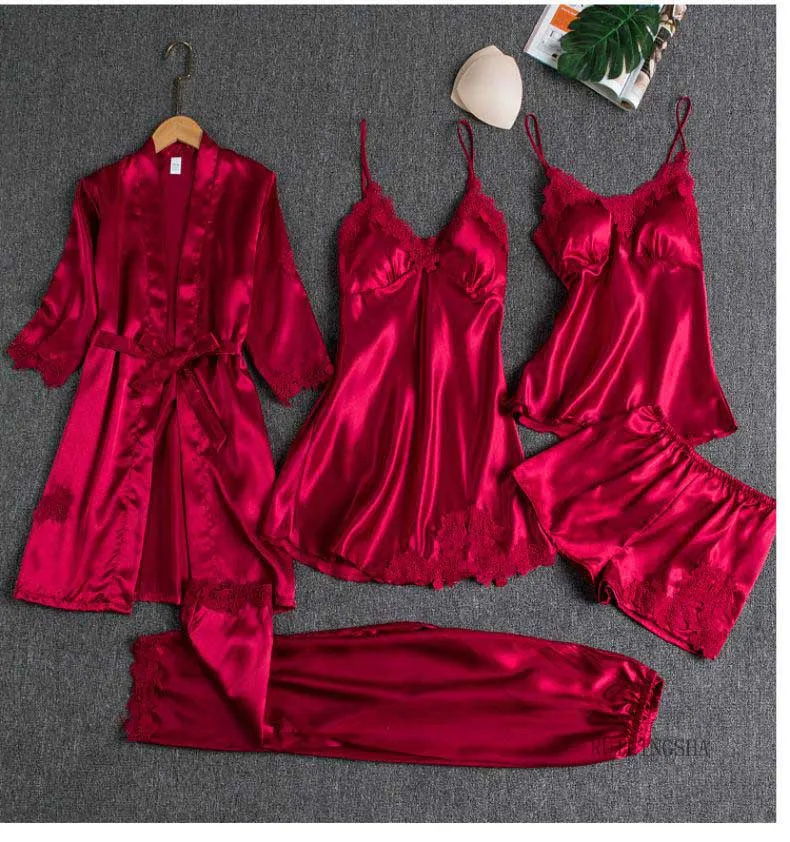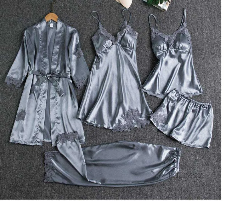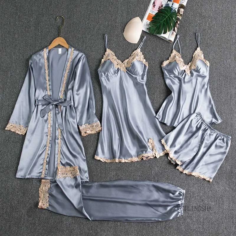 Женский пижамный комплект, из 5 предметов, атласная кружевная Лоску...