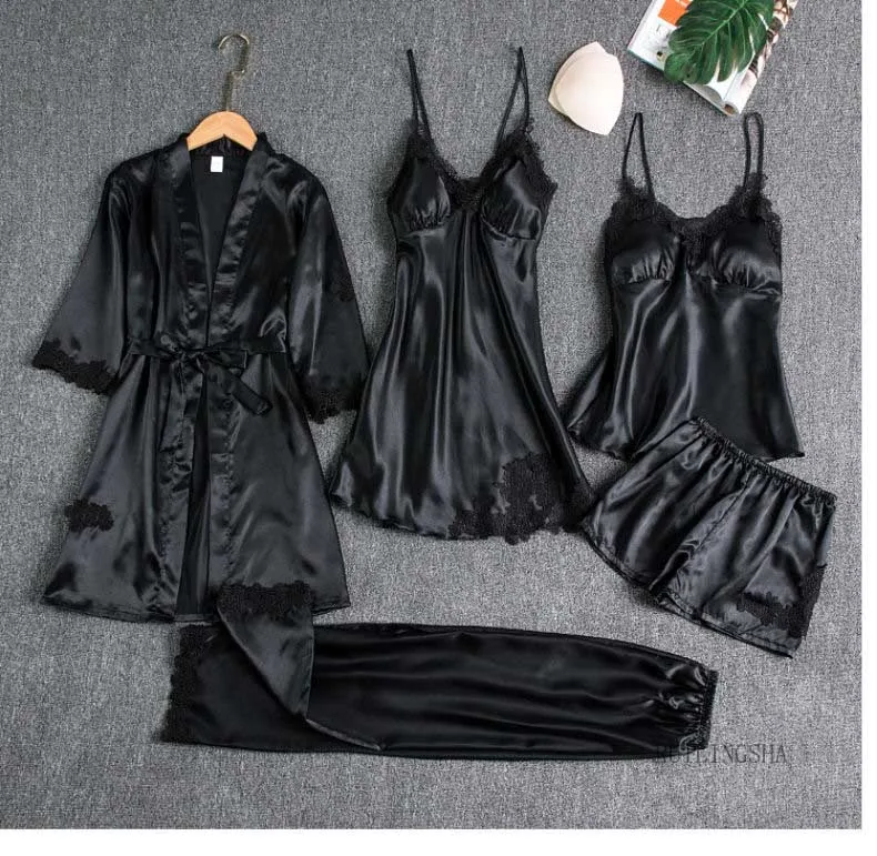 Пижама женская атласная, кружевная, комплект из 5 предметов