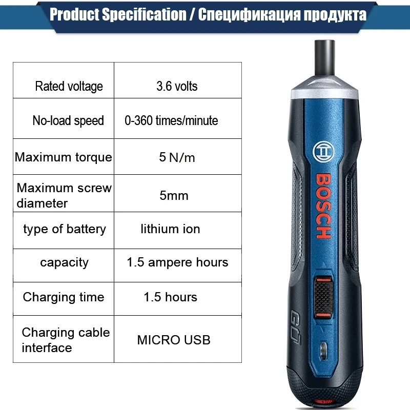 Операционной Напряжение: 3,6 вольт, без нагрузки Скорость: 360 об/минВ 4 раза мощнее любого имеющегося винта с одинаковым размером и формойИнтуитивно понятный стиль работы-просто нажмите, чтобы управлять винтами (push & Go), умный e-клатч останавливается, когда вы хотите остановитьПорт зарядки micro usb. Срок службы батареи: 1,5 Ah (встроенный)