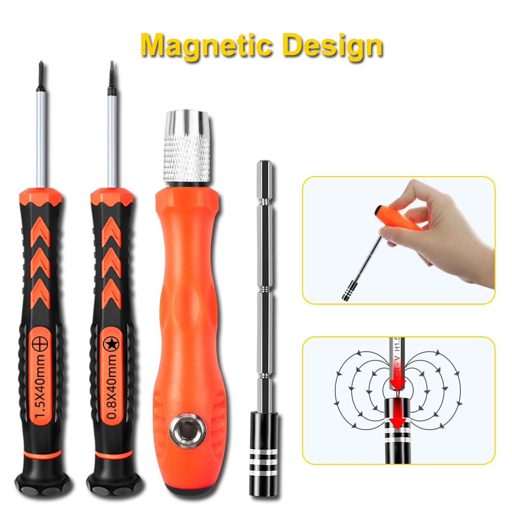 【Профессиональный Многофункциональный ручной набор инструментов 】Набор прецизионных отверток предназначен для обслуживания всех популярных iPad, iPhone, ПК, часов, очков, ноутбуков, телефонов, игровых консолей и другой электроники. Независимо от того, являетесь ли вы профессионалом или любителем в it-мире, вы можете легко работать на ремонтных компьютерах, ноутбуках и т. Д. С помощью набора.【Высокое Качество 】Магнитные биты изготовлены из CR-V стали, которая отличается высокой твердостью, хорошей прочностью, прочностью и прочностью.Прочные и гибкие удлинители вала отлично подходят для работы в стереосистеме или другой большой электроники, где все винты не находятся на поверхности.Металлические щипцы ESD изготовлены из высококачественной и прочной нержавеющей стали, устойчивой к воздействию большинства кислот и других агрессивных веществ.