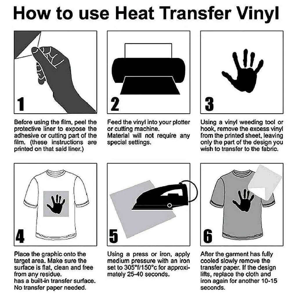 МолнияHEat Transfer виниловый Утюг на футболке текстиль тепловой прессКрикутная пленкаHTV печать для одежды сумка шляпа DIY Примечание: Если вы хотите другой размер или стиль, вы можете связаться с нами или найти его в нашем магазине. Характеристика: Насыщенный цвет, имеет ощущение стерео после завершения, хорошие клеевые свойства, не растрескивается при стирке много раз. Без специфического запаха, моды и окружающей среды. Не нужно подгонять, один предмет одежды может быть напечатан, это Непрозрачный рисунок на одежде темного цвета. Используйте свой силуэт Камея, для цепи, или любой другой бренд электронного резака, способный резать в обратном или зеркальном изображении. Вы также можете использовать тяжелый бумажный дырокол для вырезания изображений. Хорошо работает с войлоком, полиэстером, хлопком, поли-хлопком, акрилом, кожей и бумажными материалами. Украшения для футболок, джинсов, лент, обуви, сумок. Нельзя применять к: одежде с водонепроницаемым покрытием из нейлона, металлической поверхности, фарфорового пластика и дерева. Характеристики: Материал: искусственная кожа Толщина: около 0,35 мм Размер: 12 дюймов * 10 дюймов (30*25 см)/12 дюймов * 19 дюймов (30*50 см) Цвет: серебристый/фиолетовый/синий Температура штамповки: 150-190 градусов/305 °F Время тиснения: 8-15 секунд Давление штамповки: в соответствии с реальной ситуацией Прочность на разрыв: горячая и холодная слеза Инструкции по печати: Поместите пленку теплопередачи/винил на резную машину и Отрегулируйте давление и скорость; Выберите изображение, которое вы хотите напечатать на компьютере, и выберите зеркальное изображение, а затем нажмите на кнопку гравировки; Вырежьте Резные узоры из пленки и Оторвите части, которые вам не нужны, Изображение готово к использованию; Наденьте Резные узоры на одежду. Напечатайте изображение с помощью машины передачи тепла с температурой 150 ℃ ~ 190 ℃ Градусов в течение 8-15 секунд, и снимите прозрачную защитную пленку сразу, затем изображение было передано на одежду. Эти инструкции могут отличаться в зависимости от машины передачи, используемой для применения. Может потребоваться разница во времени, давлении и/или температуре. Настоятельно рекомендуется правильное тестирование. Инструкции по стирке: Выверните одежду наизнанку. Машинная стирка в холодной воде с мягким моющим средством. Нет отбеливателя. Сушить в обычной сушилке на бытовых машинах (не подвергать химической чистке). Инструкции применяются только к материалу, пожалуйста, следуйте инструкциям по стирке одежды. Посылка включает в себя: 1XМолнияВинил с теплопередачей