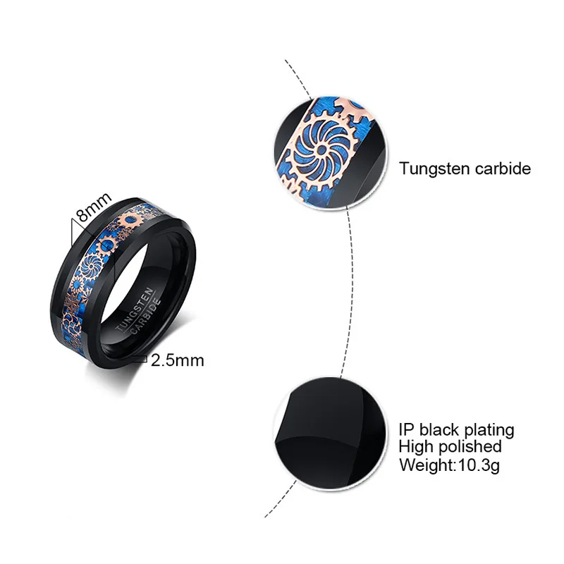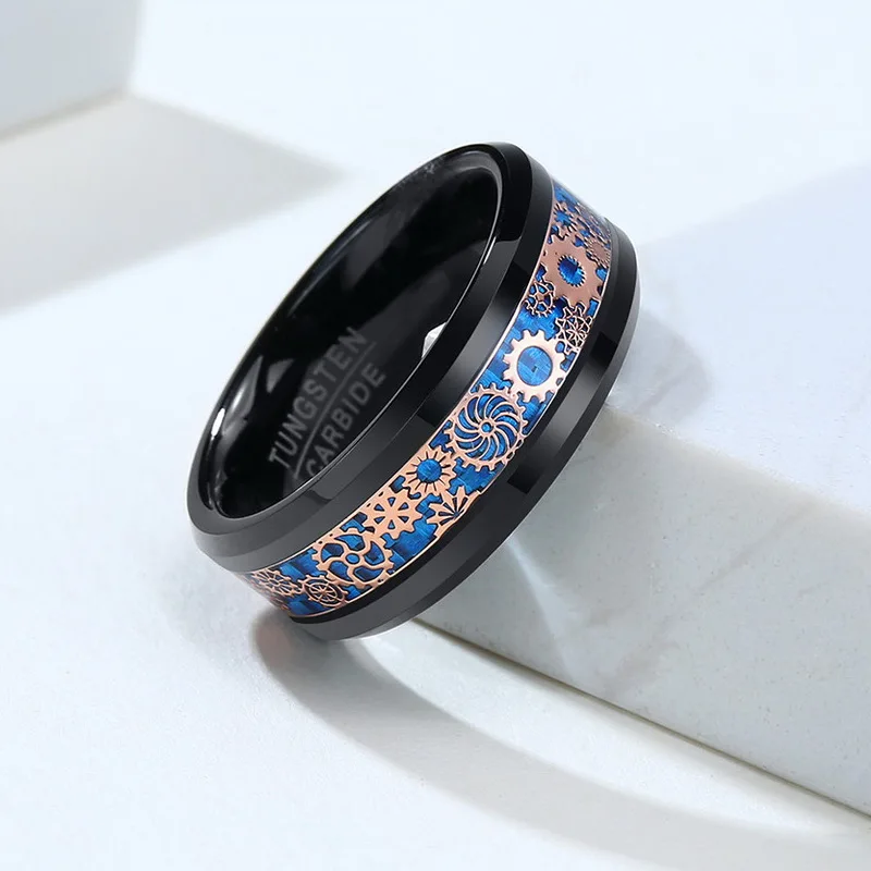 8 мм черные вольфрамовые кольца для мужчин и женщин Паровые панковские зубчатые колеса синие карбоновые волокна инкрустация скошенными краями классический мужской свадебный ремешок