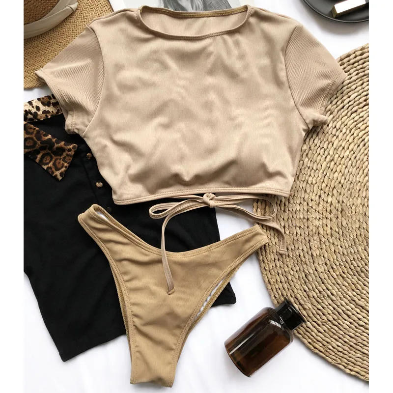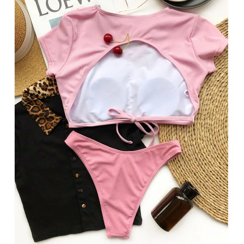 Mossha 2021 Спортивный Розовый ребристый бикини с коротким рукавом ...