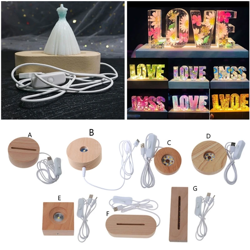 Деревянная подставка ручной работы, прямоугольная, круглая, овальной формы, со светодиодным дисплеем, художественное украшение из смолы, деревянная подставка с ночной подсветкой 87HB