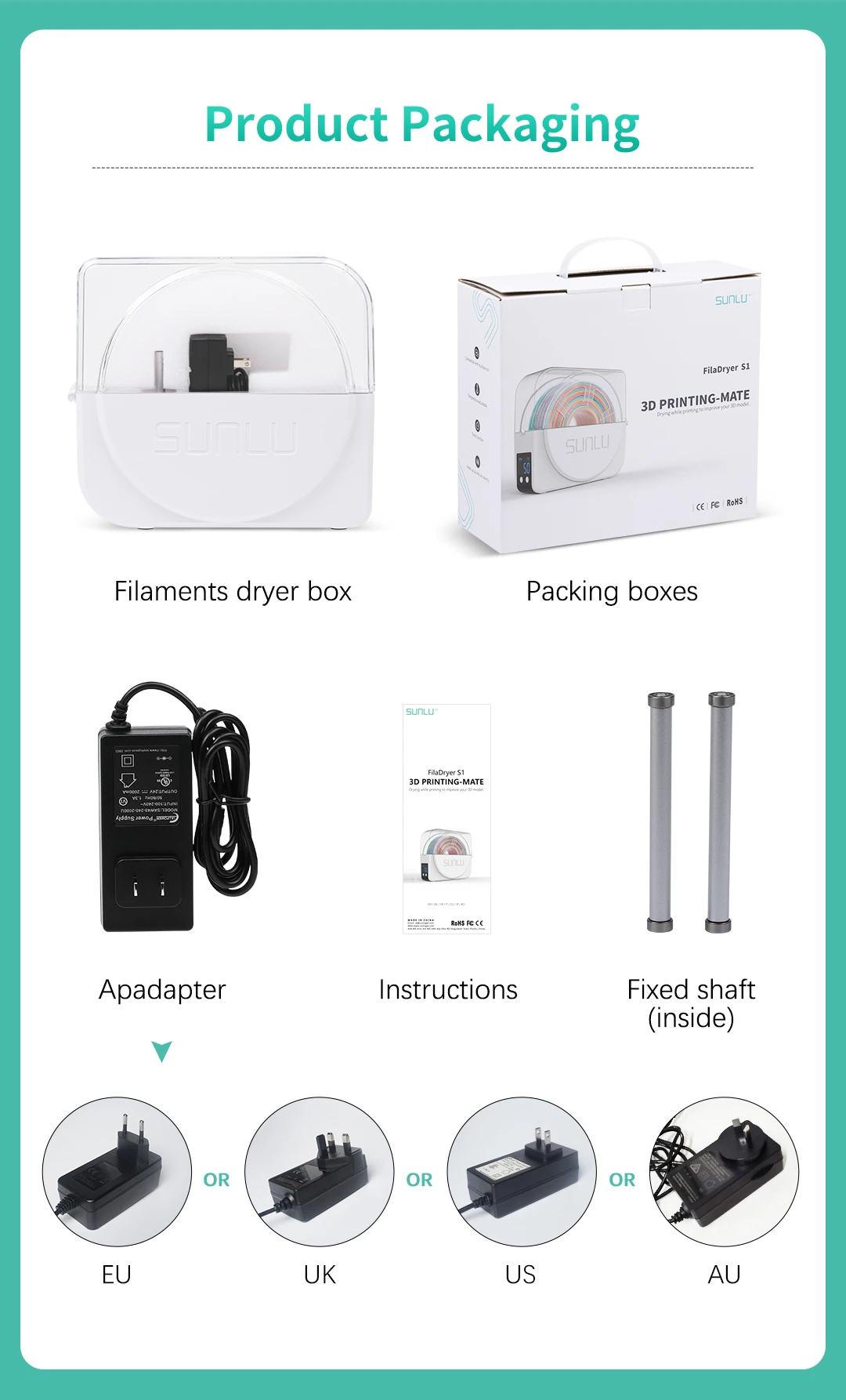 Наименование: сушилка для нити S1Цвет: белыйДиапазон температур: 35-55 ℃Штепсельная Вилка: мы выберем вилку в соответствии с вашей странойДиаметр нити: 1,75 мм/2,85 мм/3,00 мм