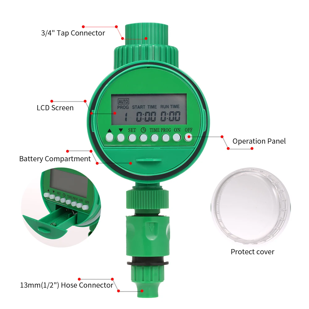 Описание:Этот таймер отличается простой, простой установкой и программированием. Нет необходимости в инструментах. Просто установите время начала, продолжительность полива и частоту. Большой, легко читаемый ЖК-экран облегчает программирование. Больше нет мертвых растений или туманных газонов, потому что вы забыли их поливать.Особенности:Самый длинный период может быть установлен один раз в 30 дней, время полива может быть точным до 1 минуты, до 9 часов 59 минут.Большой ЖК-экран с индикатором низкого заряда батареи показывает состояние орошения и стандартное время/день.Переключатель ручного переопределения для сохранения программирования и обеспечения гибкого ручного полива.Подходит для крана: 1/2 "или 3/4" снаружи нити, удовлетворяет различные потребности.Мощность 2*1,5 V щелочные батареи Ni-MH, нет необходимости в проводке.Характеристики:Цвет: зеленыйМощность: 2*1,5 V щелочные батареи (не входит в комплект)Подходит для крана: 1/2 "или 3/4" снаружи резьбы.Рабочее давление воды: 0.1MPA-0.6MPAРабочая температура: 0-60 ℃Поток: 600-800л/чМатериал: АБС-пластикПосылка Размеры: 12,5*12*10 см/4,9*4,7 * 3.9inВес посылка: 303 г/10,7 унцийПримечание:1. Таймер контролирует только поток воды, это не увеличит давление воды.2. Пожалуйста, тщательно очистите фильтр.3. Меняйте аккумулятор каждые 6 месяцев, чтобы убедиться, что он хорошо работает.Посылка:1*1/2 "соединитель водопроводной воды1*3/4 "соединитель водопроводной воды1 * панель управления1 * быстроразъемный разъем