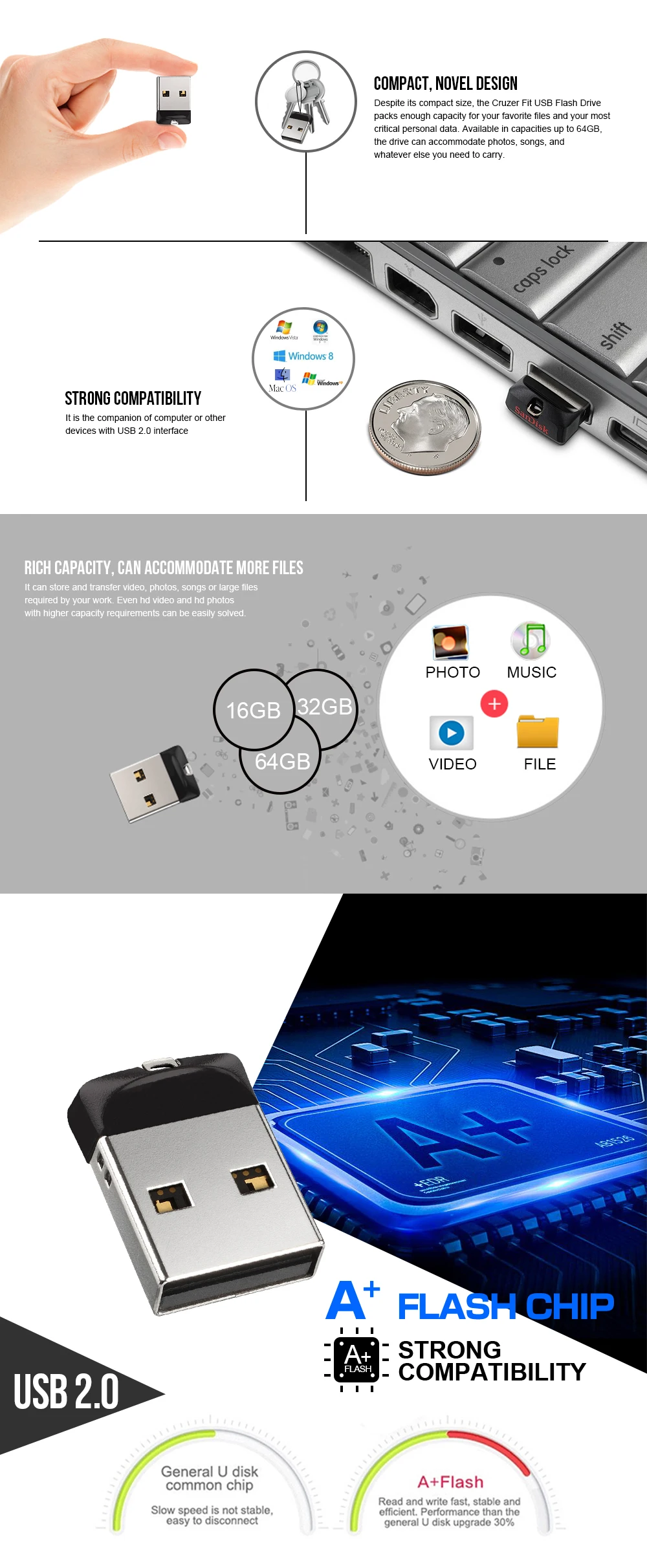 1. Подключение USB, поддержка горячего подключения и воспроизведения.2. Нет внешнего источника питания.3. Поддержка различных типов ОС.4. Твердотельный накопитель, ударопрочный и электромагнитный.5. Надежное хранение данных6. Быстрая скорость записи/чтения7. Требования к оборудованию: ПК с USB подключением, ноутбук, MAC8. Емкость: 8 ГБ/16 ГБ/32 ГБ/64 Гб/128 ГБ
