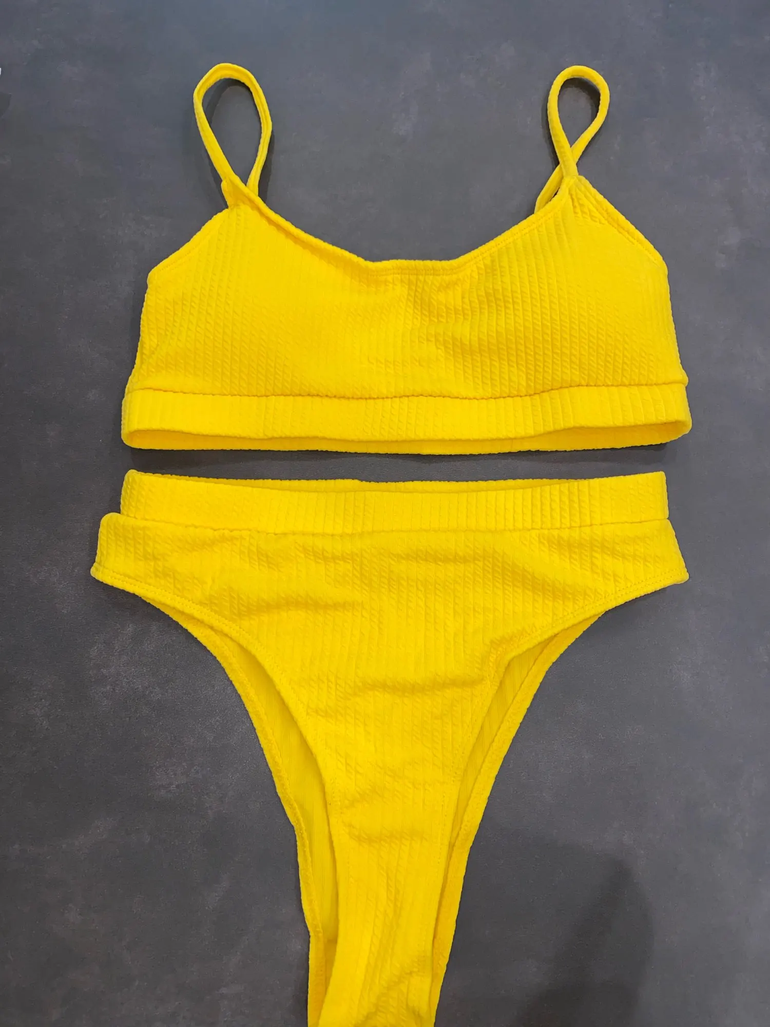Соблазнительное однотонное Желтое Бикини 2021, Женский плиссированный купальник из двух частей с высоким вырезом, пляжный купальный костюм, купальник с высокой талией, бикини