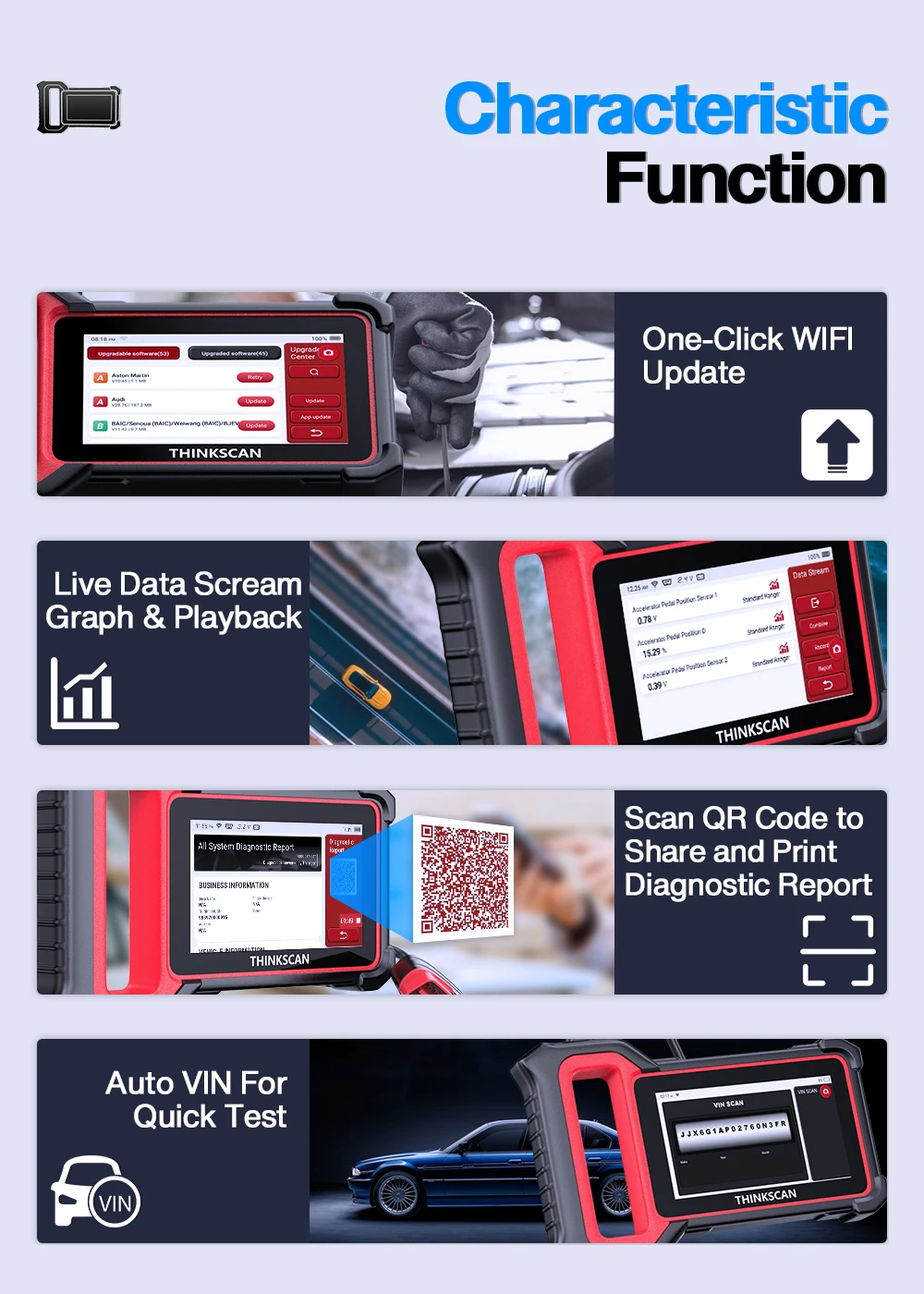 1. Обслуживание и сбросThinkscan Plus S4 поддерживает 5 систем и 3 сброса.2. Интеллектуальная ДиагностикаИспользуя последнюю версию, интеллектуальное диагностическое устройство позволит вам узнать больше о здоровье вашего автомобиля.3. Полный OBD2 EOBD диагностикиСодержит функцию OBD2, которая позволяет всегда видеть информацию о автомобиле.4. Бесплатное обновление через WiFIВы можете обновить информацию на официальном сайте.В целом, Thinkscan поможет вам обнаружить здоровье вашего автомобиля, экономя ваше время и энергию.