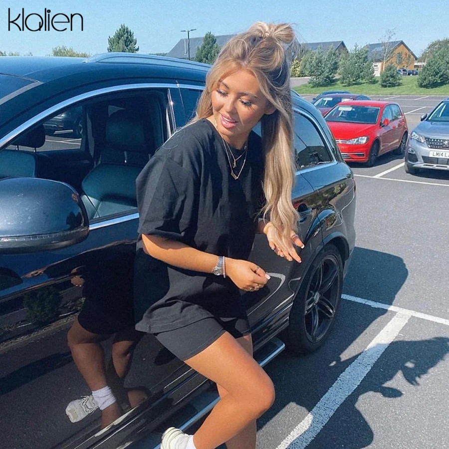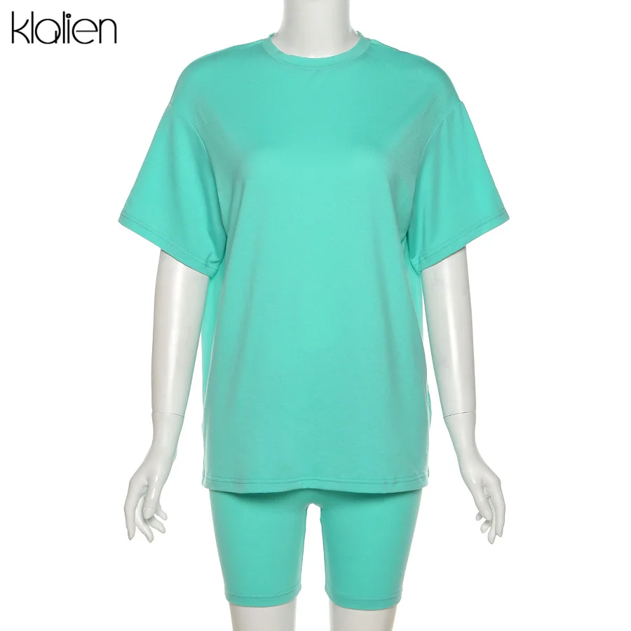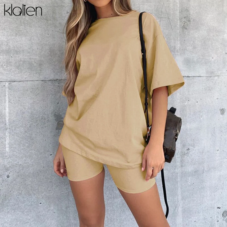 KLALIEN Летняя женская Повседневная Уличная одежда комплект из двух предметов простая модная свободная однотонная Мягкая футболка и шорты наряд женский спортивный костюм