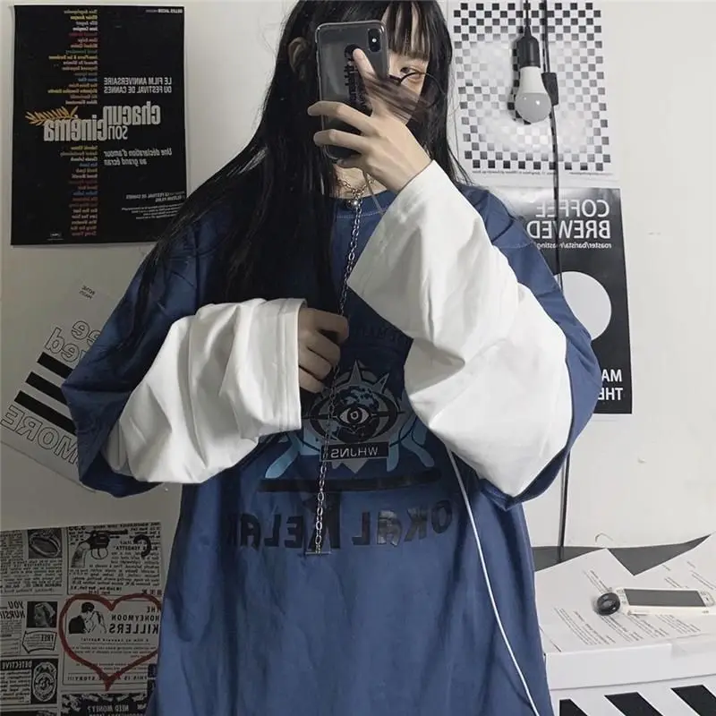 Футболка с длинным рукавом bf в стиле Харадзюку, футболка с имитацией двух частей, женская и мужская футболка большого размера, одежда для улицы в стиле панк
