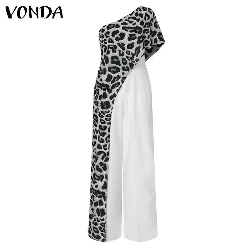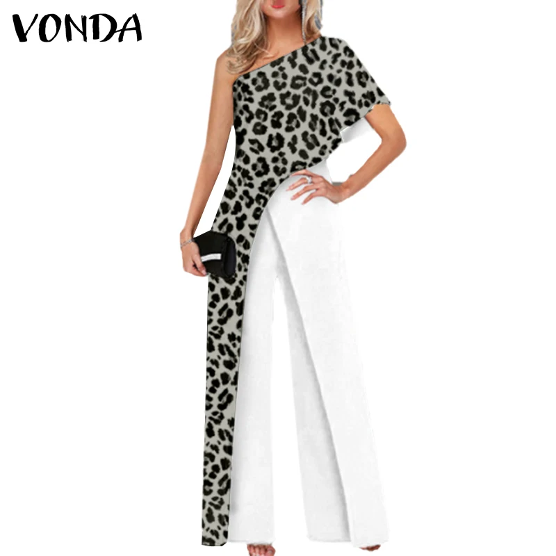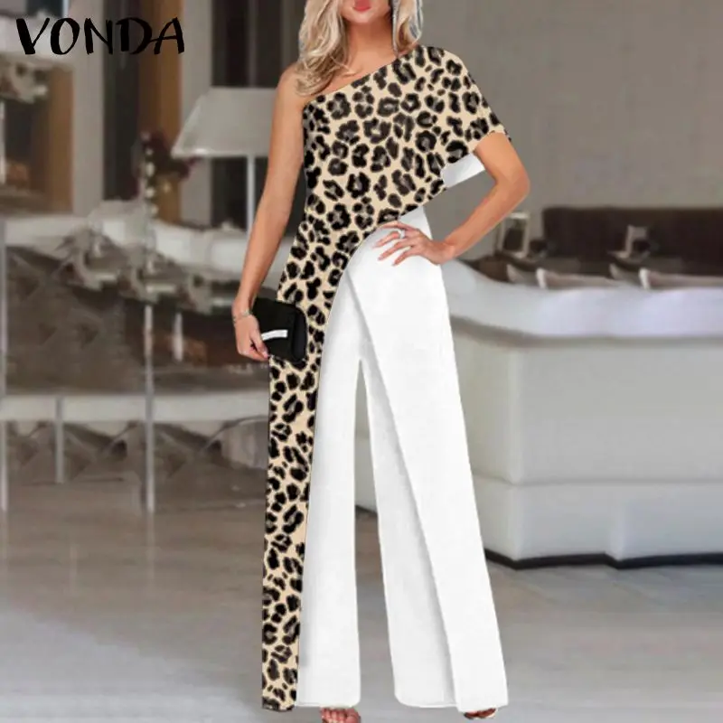 Женский комбинезон VONDA на одно плечо с леопардовым принтом, винтажный комбинезон Палаццо со штанами, короткими рукавами, длинные брюки с широкими штанинами, 2021