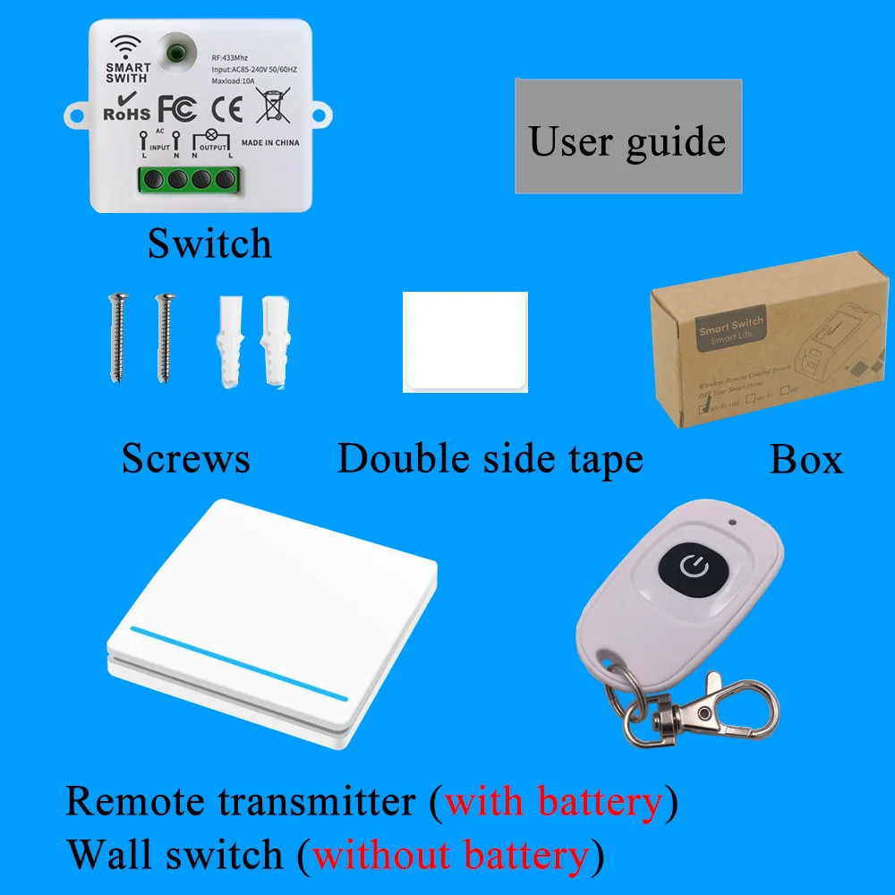 Посылка включает в себя 1 шт. радиочастотный мини-приемник2 шт. двухсторонние лентыВинты 2 шт.1 шт. Руководство пользователя Настенные переключатели с винтами и двойными боковыми лентамиПульты
