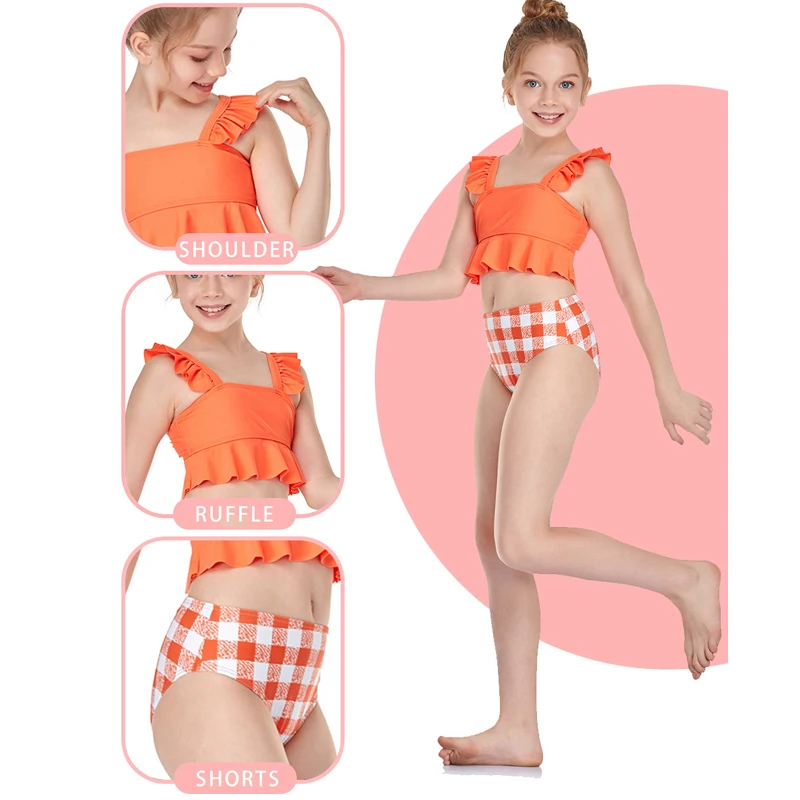 Летние Купальники с рюшами для девочек; 2 предмета; Детский купальный костюм; Спортивный купальник для девочек-подростков; Пляжная одежда для детей; Раздельная одежда для плавания