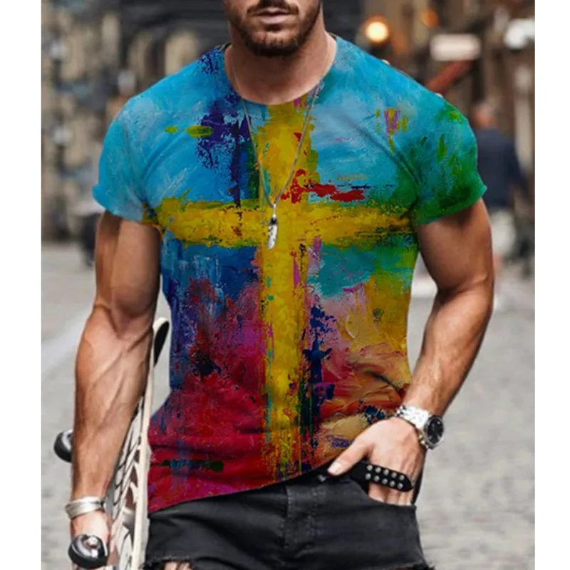 Мужская Ретро футболка с коротким рукавом, модная цветная повседневная одежда в стиле Харадзюку С 3D принтом Креста и круглым вырезом для лета