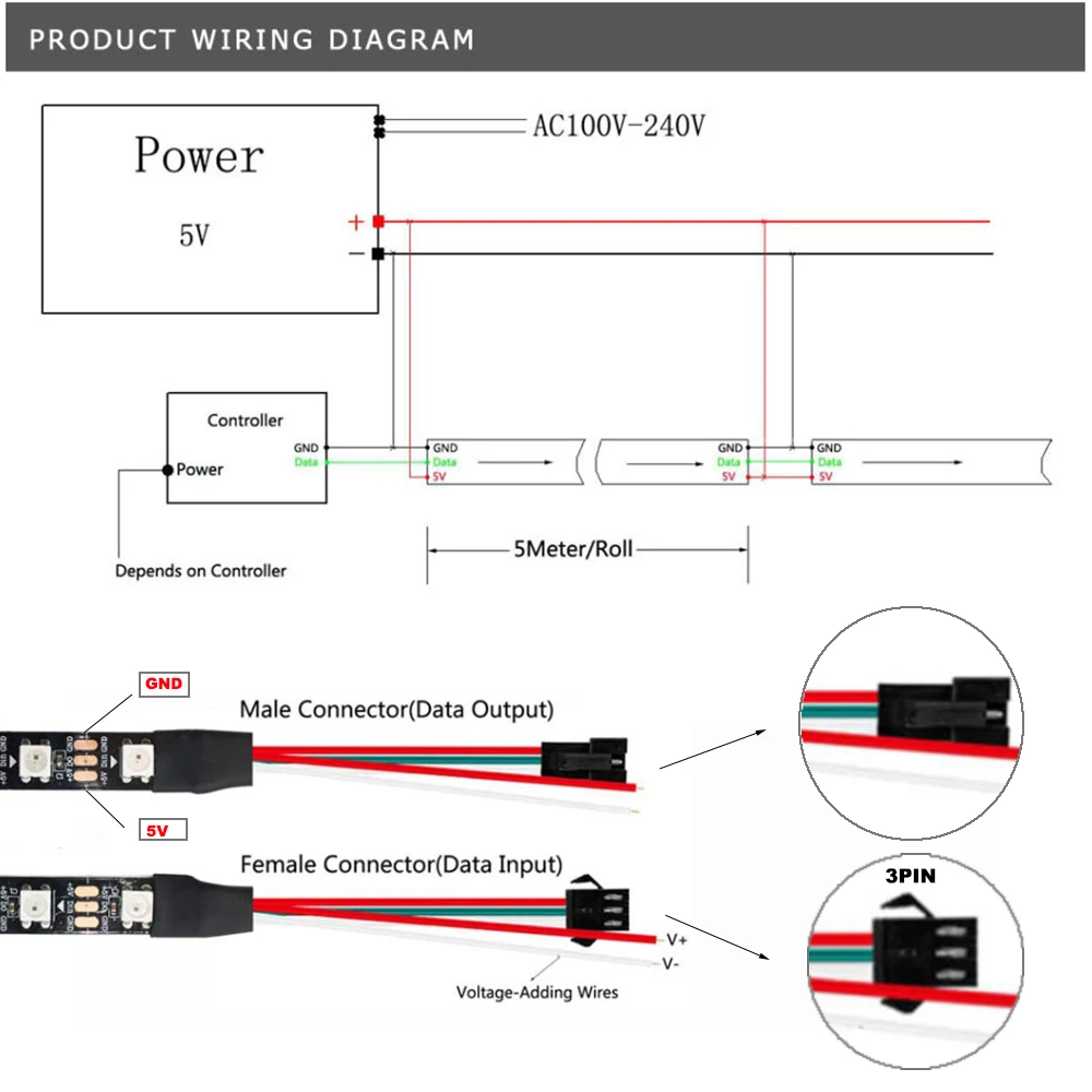 1. Светодиодная лента WS2812B питается от "5 В питания" (не входит в комплект) и управляется одной линией передачи данных от подходящего контроллера (не входит в комплект).